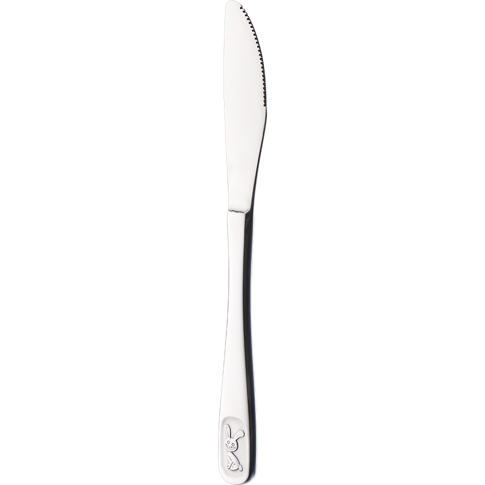 Mit diesem tollen Besteck der Serie Kids werden sich Ihre kleinen Gäste „wie ein(e) Große(r)“ fühlen und den Besuch in Ihrer Gastronomie lieben. Auf dem flachen Griff dieses Messers kann Ihr kleiner Gast ein liebevoll gestaltetes Häschen erblicken und erfühlen. So macht das Essen doppelt Spaß! Diese Klinge hat einen leichten Wellenschliff und ist daher besonders für Kinder mit Erfahrung beim Schneiden geeignet!