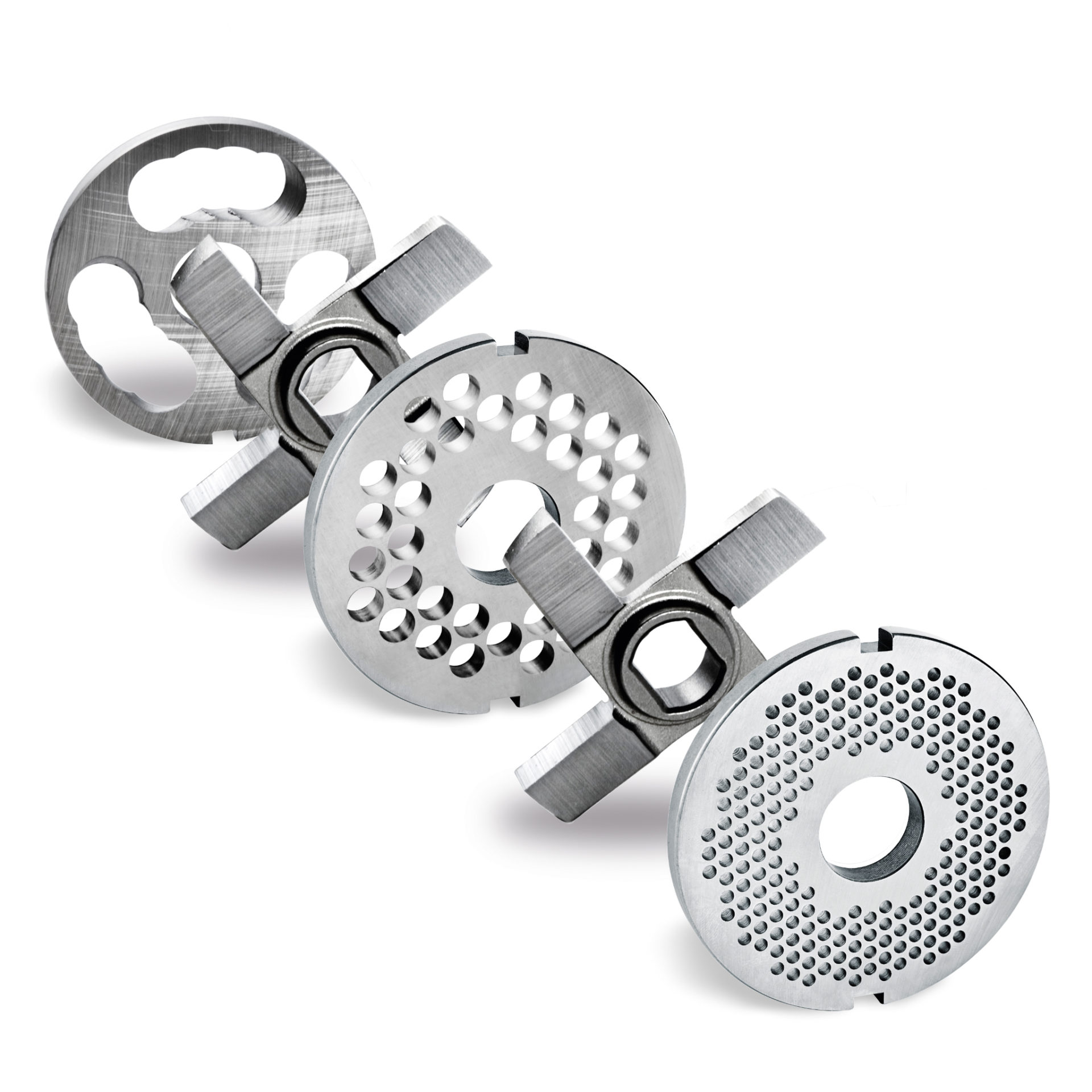 - Mit 5-teiligem Unger-Schneidsatz: Vorschneider, 2 Messer, 2 Lochscheiben (standardmäßig 3 und 7,8 mm)