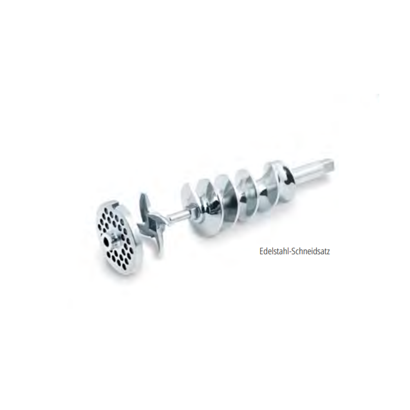 Der Fleischwolf mit bis zu 120 kg Kapazität ist ideal für die schonende Zerkleinerung kleiner bis mittlerer Mengen Fleisch. Der zweiteilige Schneidsatz, bestehend aus Messer und Lochscheibe (Ø 70 mm), sorgt für optimale Zerkleinerung des Fleischs. Zwei Messer und zwei Lochscheiben (Lochdurchmesser 4,5 und 6 mm) sind im Lieferumfang enthalten. Maschinen- und Schneckengehäuse, Schneidsatz und Einfüllwanne sind aus rostfreiem Edelstahl gefertigt und für eine leichte Reinigung schnell demontierbar.