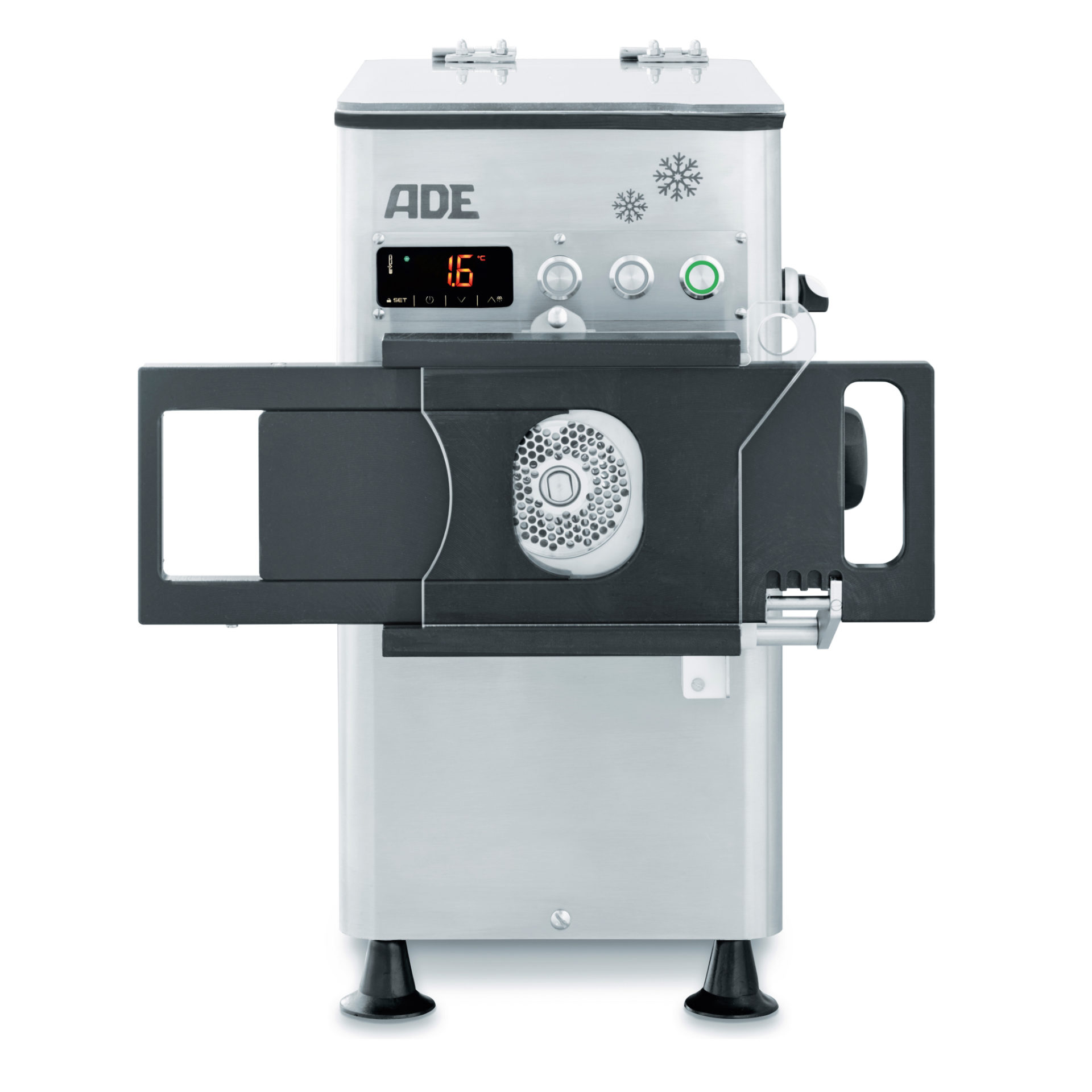- Sicherung der Kühlkette durch integrierte Kühlung an Einfüllschale, Einfülltrichter und Schneidsatz