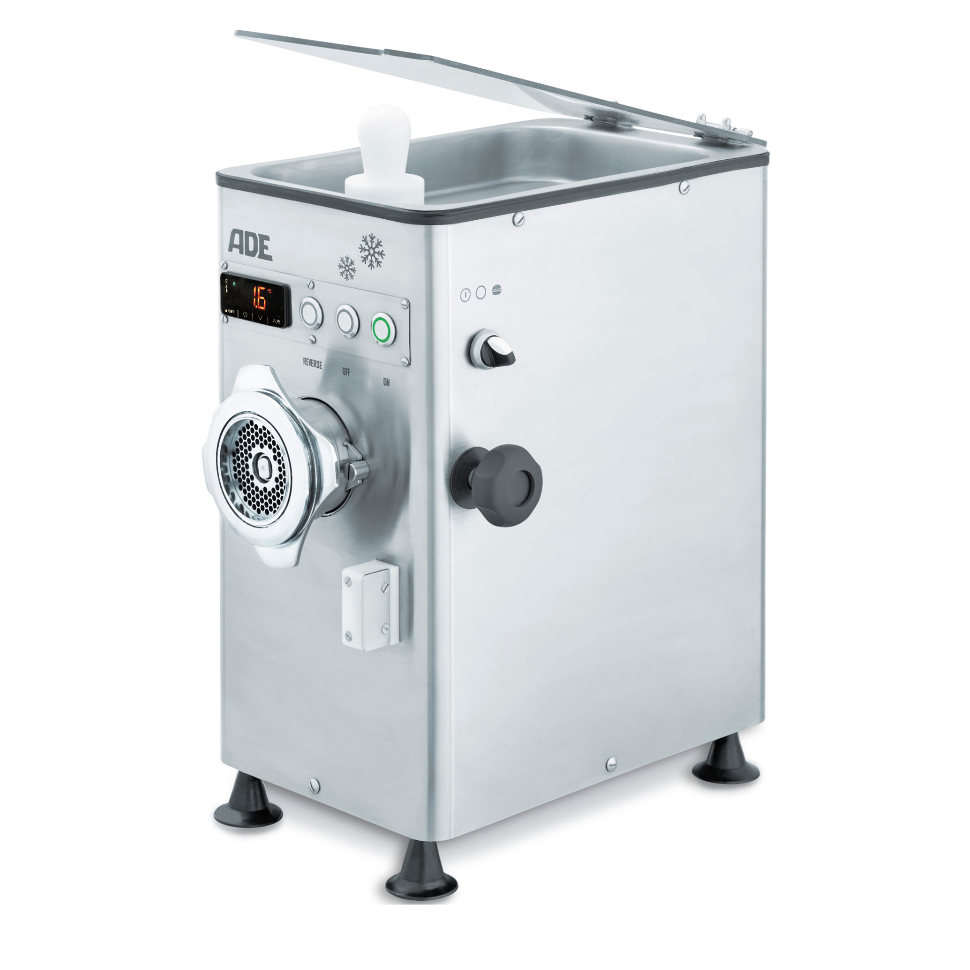 Die integrierte Kühlung dieses Fleischwolfs sichert die Einhaltung der Kühlkette, während bis zu 280 kg Fleisch schonend zerkleinert werden. Geliefert wird das Modell mit einem variablen Vorsatz zur Herstellung von Pattys zwischen 100 g und 170 g. Gekühlt werden Einfüllschale, Einfülltrichter und Schneidsatz. Die Kühltemperatur wird über das Touch-Display eingestellt. Sollten ggf. Lebensmittel im Schneckengehäuse festsitzen, erlaubt die Vor- und Rücklauffunktion eine kurze Rückwärtsbewegung.