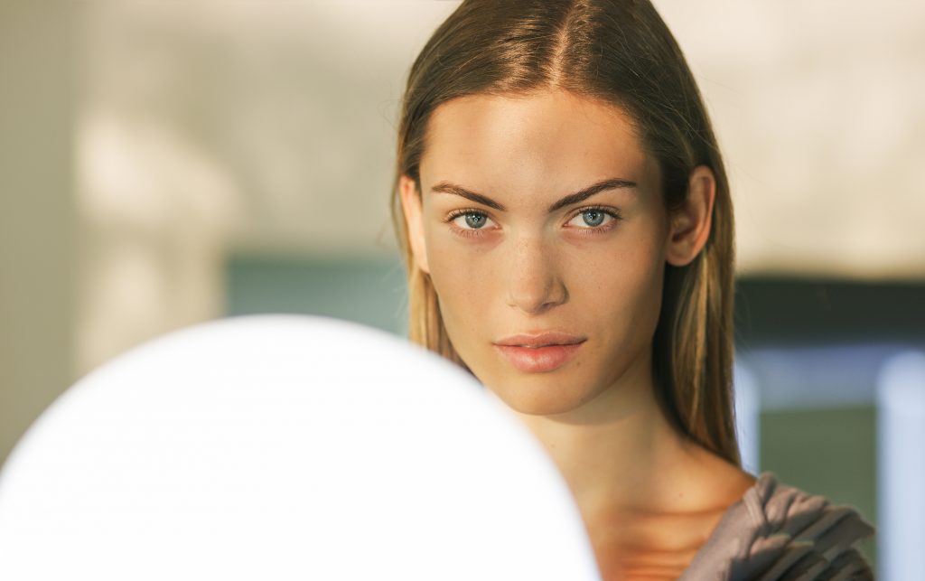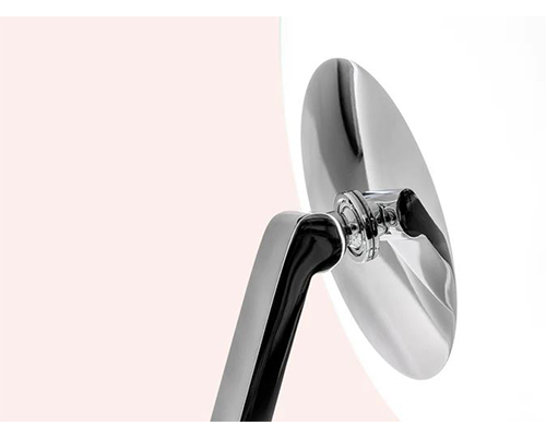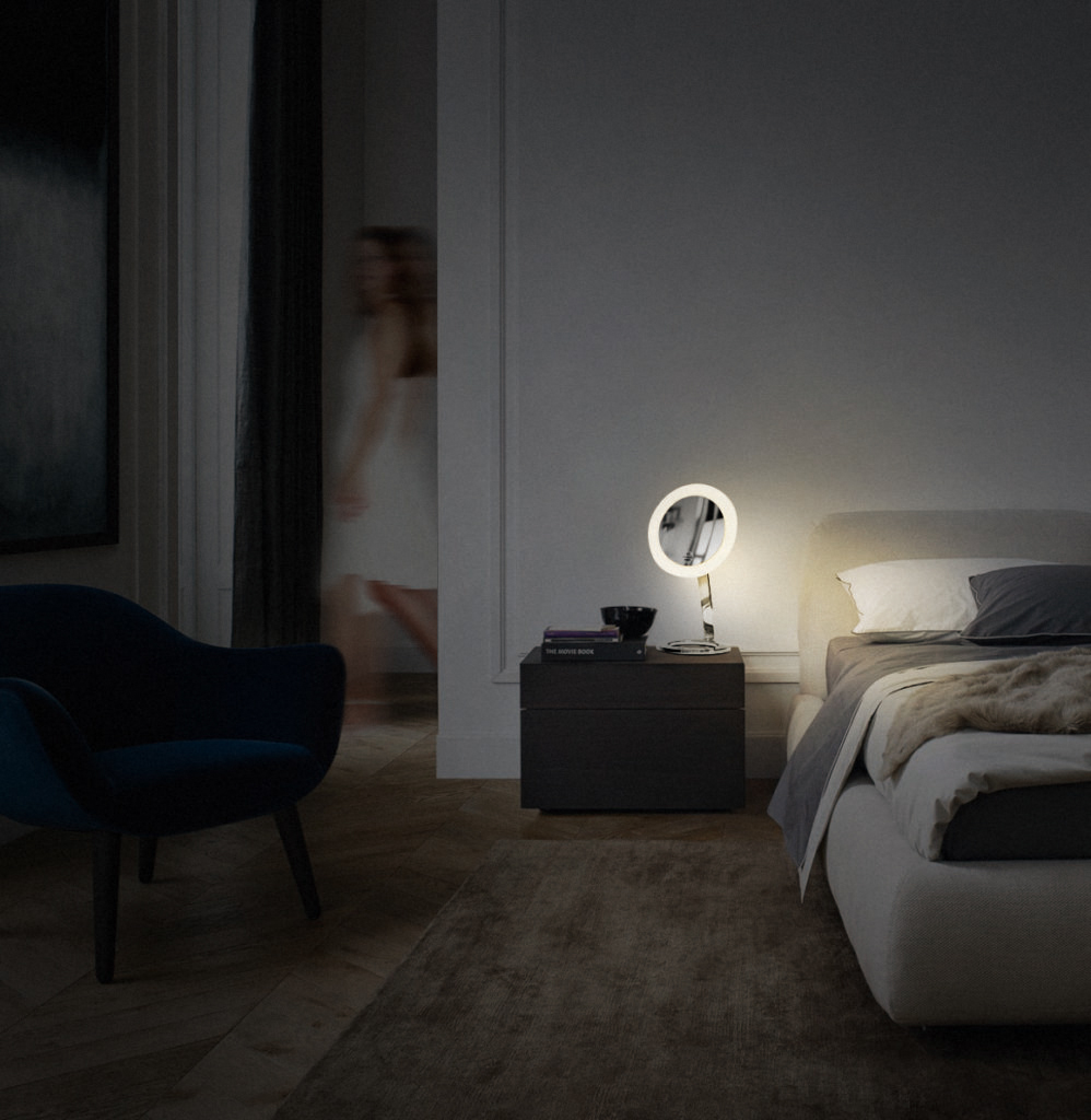 Visuelle Spannung entsteht durch asymmetrische Synergie: der rechteckige Spiegelarm verbindet das runde Acrylgehäuse mit einem markanten runden Sockel. Ungewöhnliche Formensprache für eine ergonomisch intuitive Lösung; die mattierte Acrylabdeckung auf der Rückseite des Spiegels ermöglicht ein Hintergrundlicht für eine warme, personalisierte Präsentation.