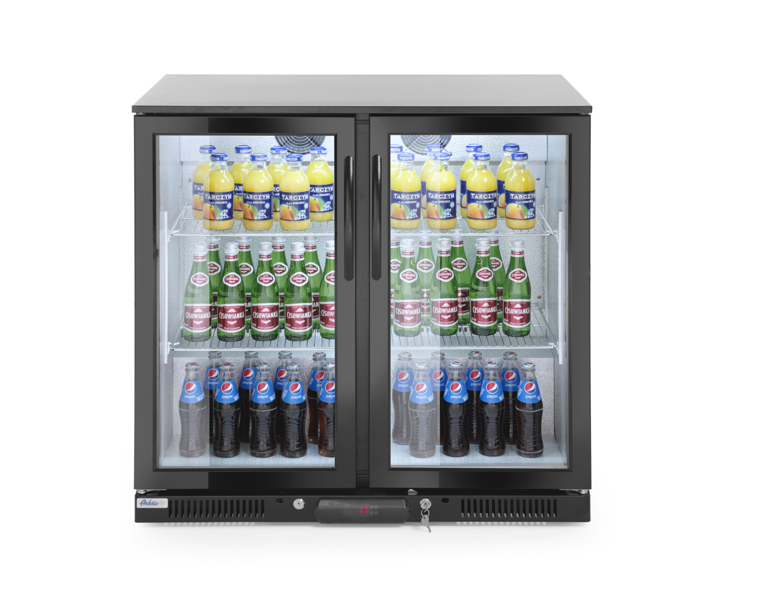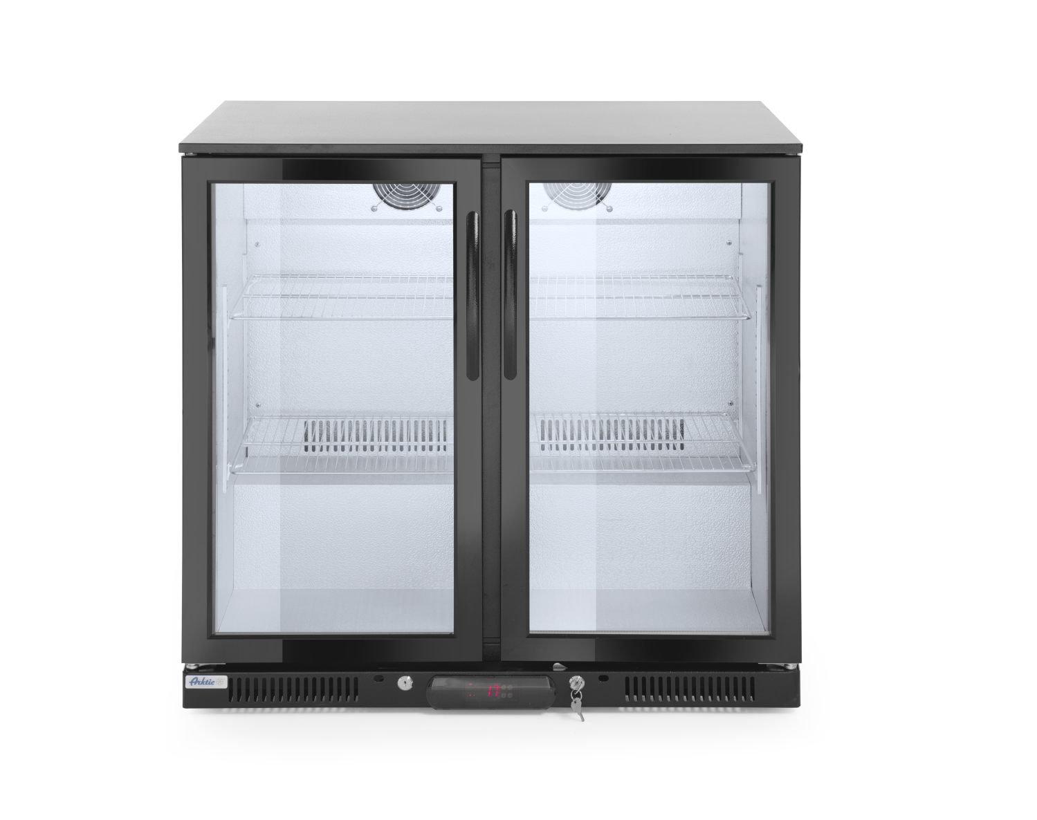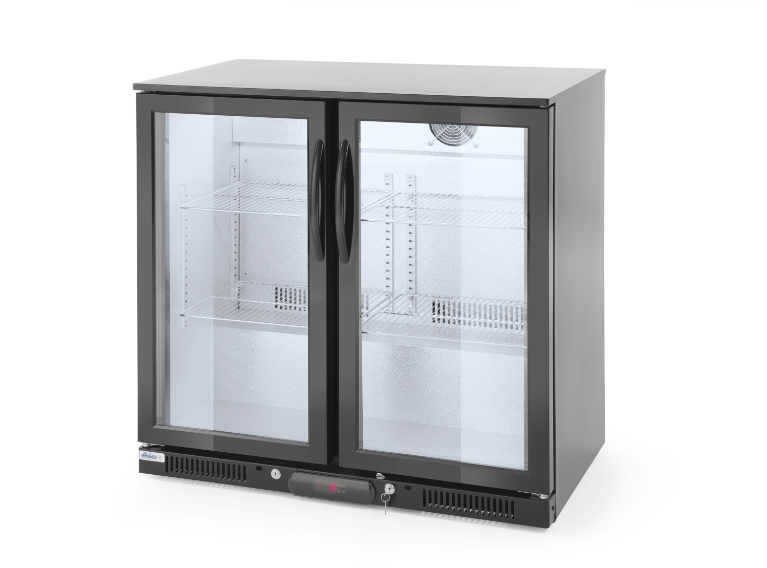 Pulverbeschichtetes Gehäuse, Aluminiumkammer, verschließbare Kunststofftür(en) mit gehärtetem Glas. Ausgestattet mit Lüfterkühlung und automatischer Abtauung. Mit LED-Innenbeleuchtung. Mit Digitalanzeige und Temperaturregelung. 4 verstellbare Anti-Rutsch-Füße. Kühlmittel: R600a. Doppeltür, mit 4 verchromten Regalböden.