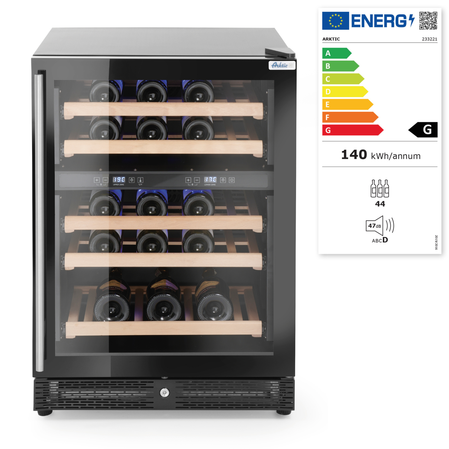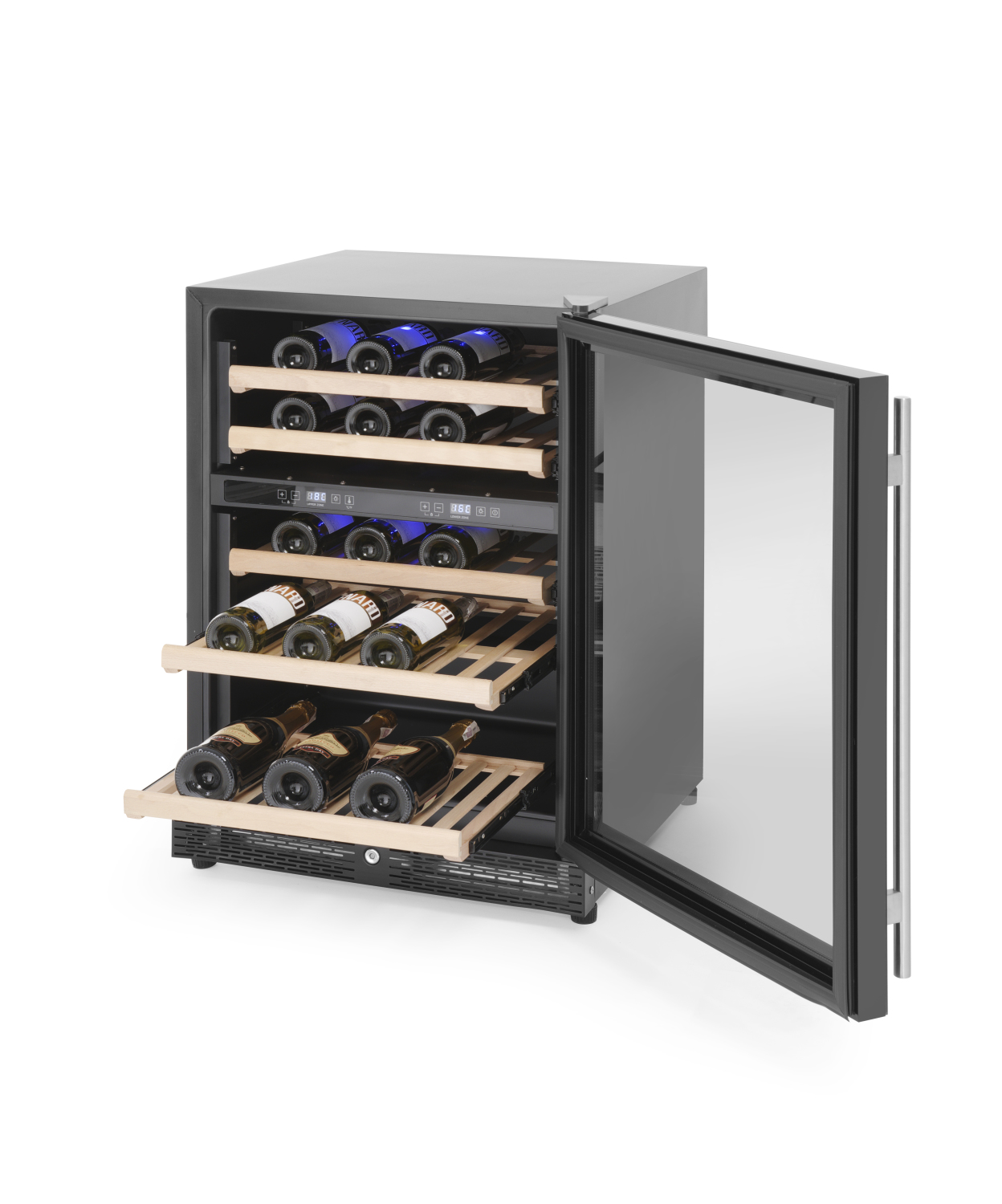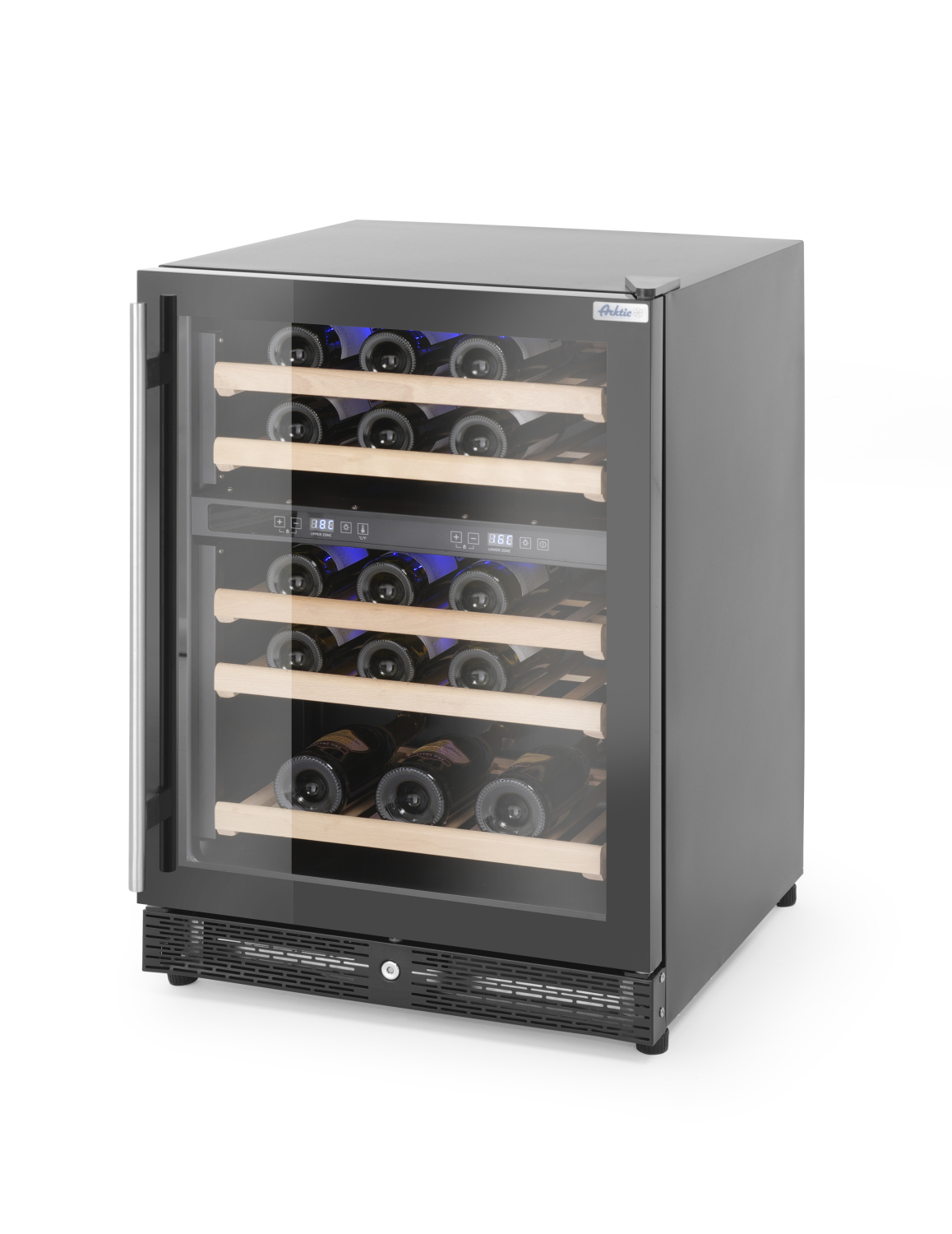 Dank der 2 Zonen können Sie 2 verschiedene Temperaturen einstellen und somit 2 unterschiedliche Weinsorten immer perfekt auf Serviertemperatur lagern. Schwarz pulverbeschichtetes Gehäuse, randlose Glastür mit stilvollem Edelstahlgriff. Umluftkühlung mit automatischer Abtauung, Kompressor hinter der Kammer. Helle LED Beleuchtung in der Decke. Digital-Display und -Temperaturregler. Anzeige in Celsius oder Fahrenheit möglich. 4 höhenverstellbare Anti-Rutsch-Füße. Klimaklasse: N-ST. Kühlmittel: R600a. Bietet Platz für 43 Flaschen Wein.