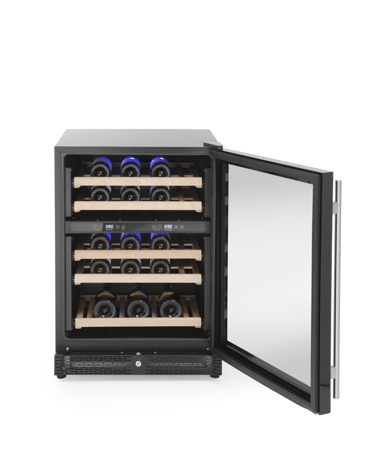Geräumiger Weinkühlschrank mit 2 separat einstellbaren Kühlzonen. Die Verwendung einer randlosen Glastür sowie von hochwertigen Holzeinlegeböden sorgen für eine ansprechende Optik.