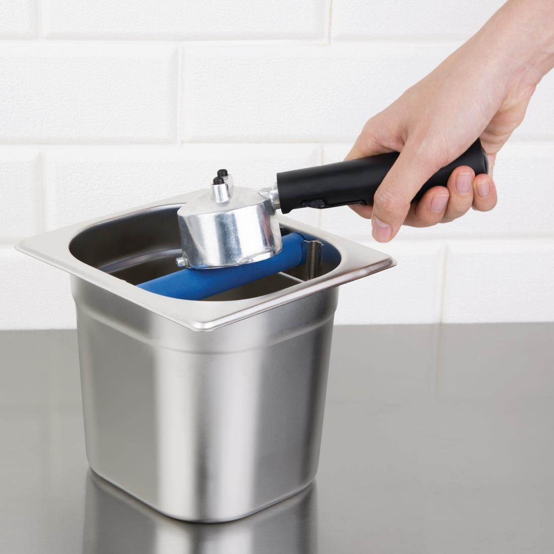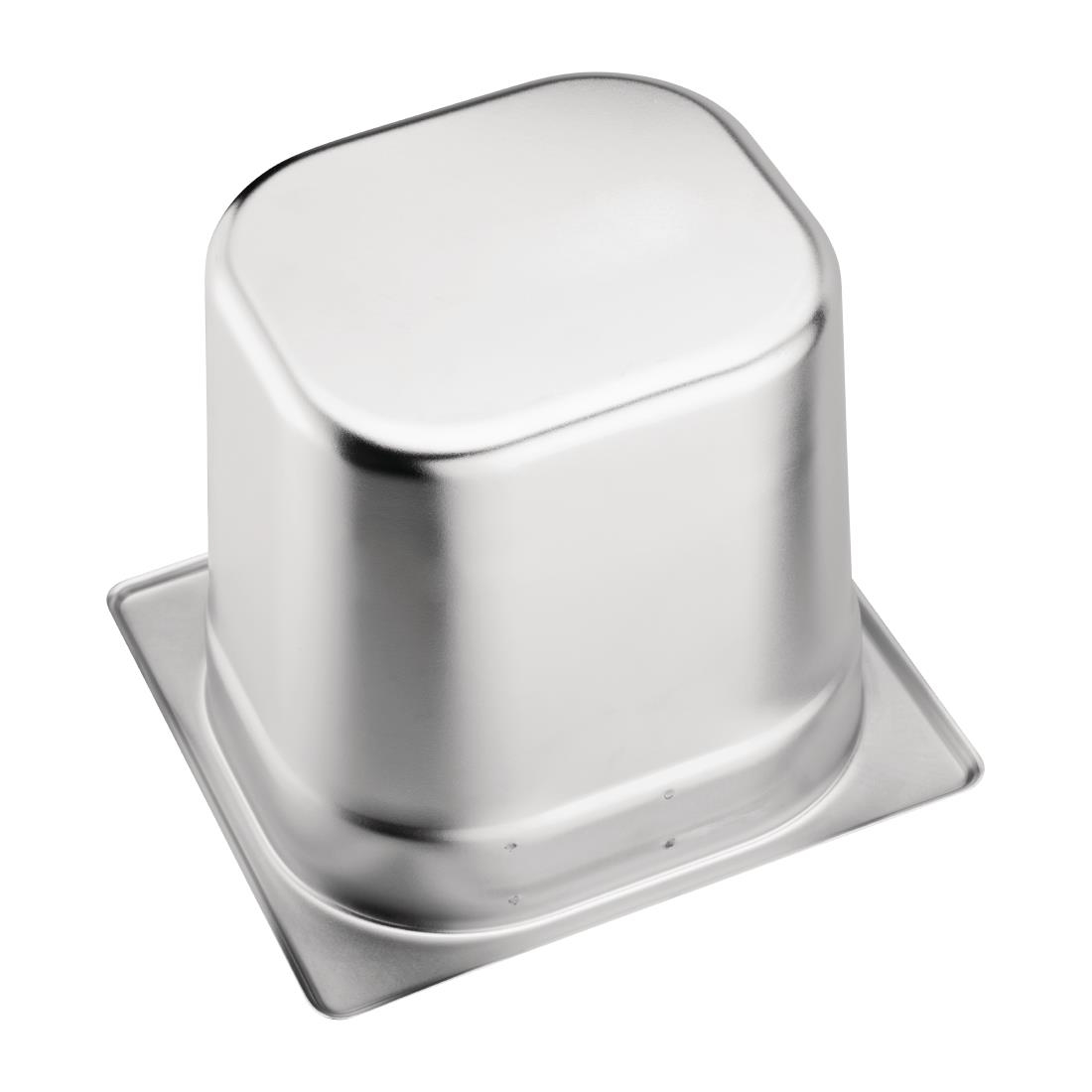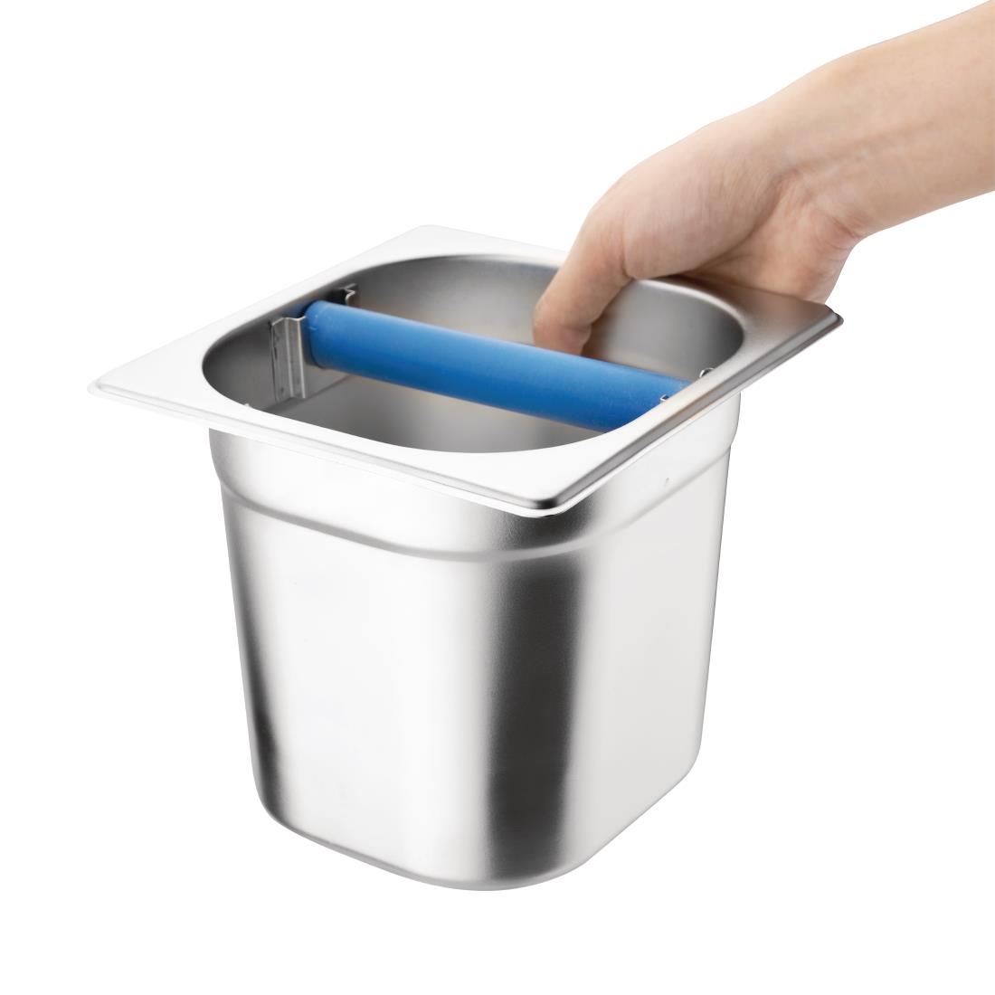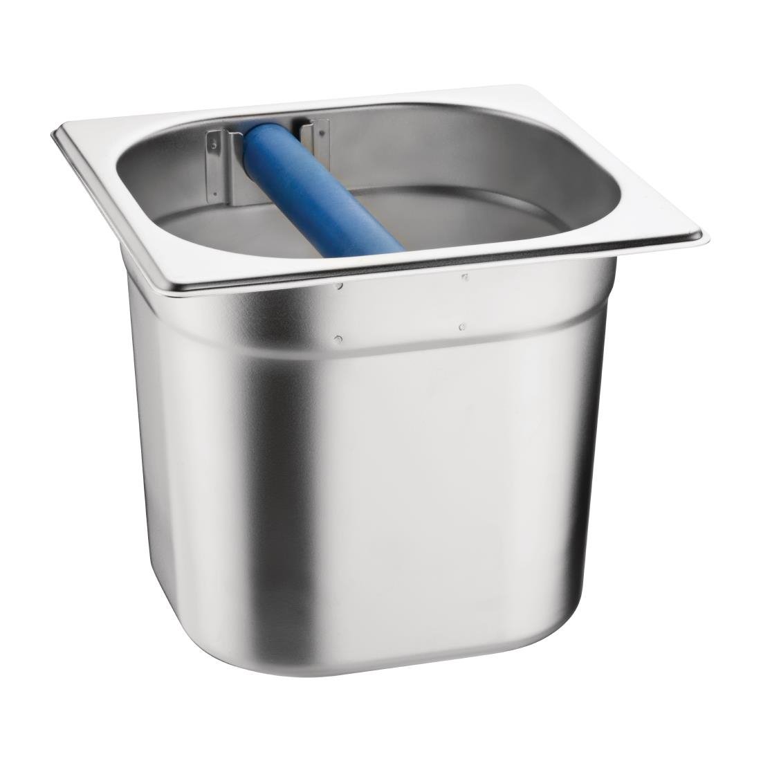 1/6 GN Behälter aus Edelstahl mit festen PVC-Klopfrand. Abmessungen (cm): 15(H) x 17,4(B) x 16(T)