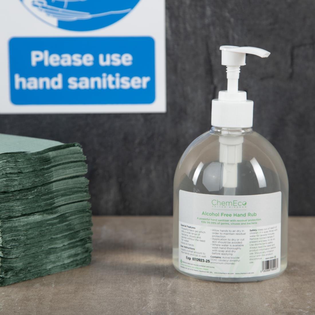 Bitte verwenden Sie das selbstklebende Händedesinfektionszeichen A5