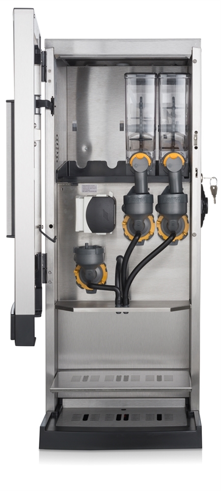 Modell für 2 BIB Behälter für Flüssigkonzentrat und 2 Instantproduktbehälter für 8 verschiedene Produkte sowie Heißwasser. Gesonderte Heißwasserausgabe. Getränkeauswahl variiert in Abhängigkeit von den eingesetzten Produkten.