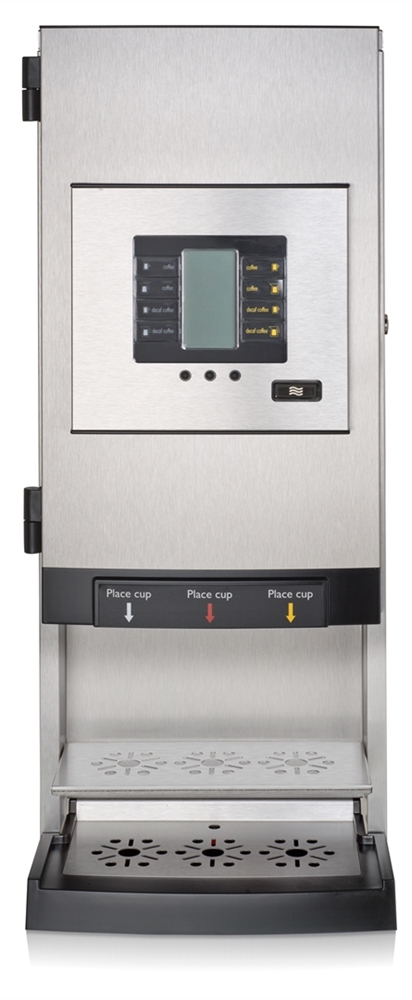 Modell für 2 BIB Behälter für Flüssigkonzentrat für 2 Getränke und Heißwasser. Parallele Produktausgabe. 4 Einstellungen je Getränk wie Tasssen-, Becher- und Kannenausgabe sowie Freilauf. Getränkeauswahl variiert in Abhängigkeit von den eingesetzten Produkten.