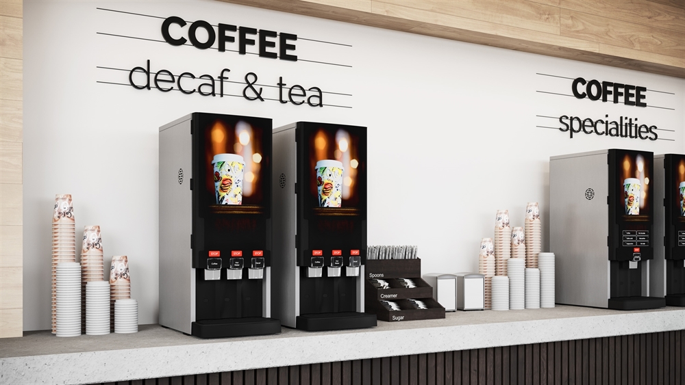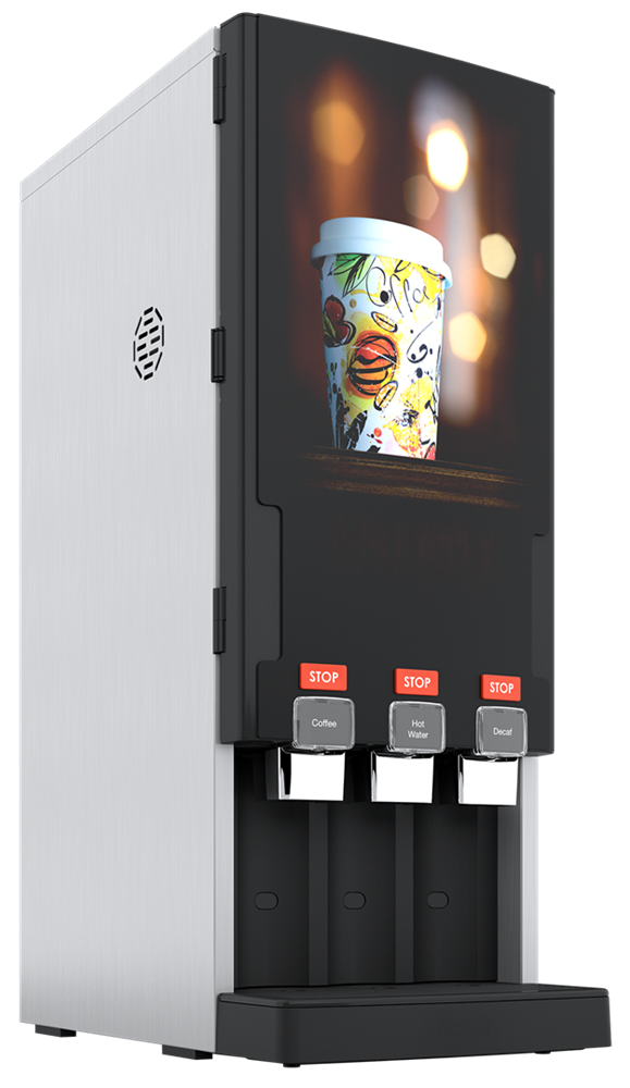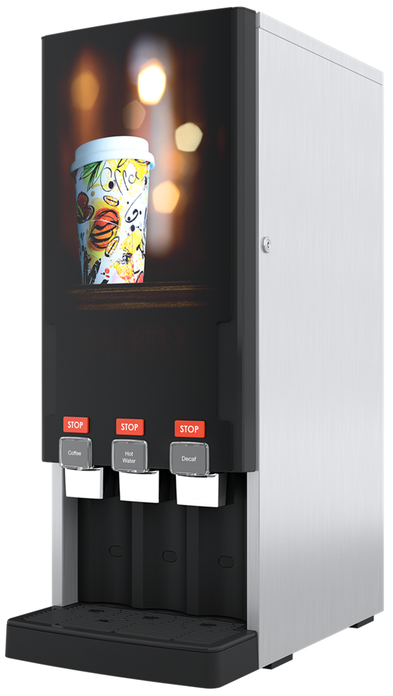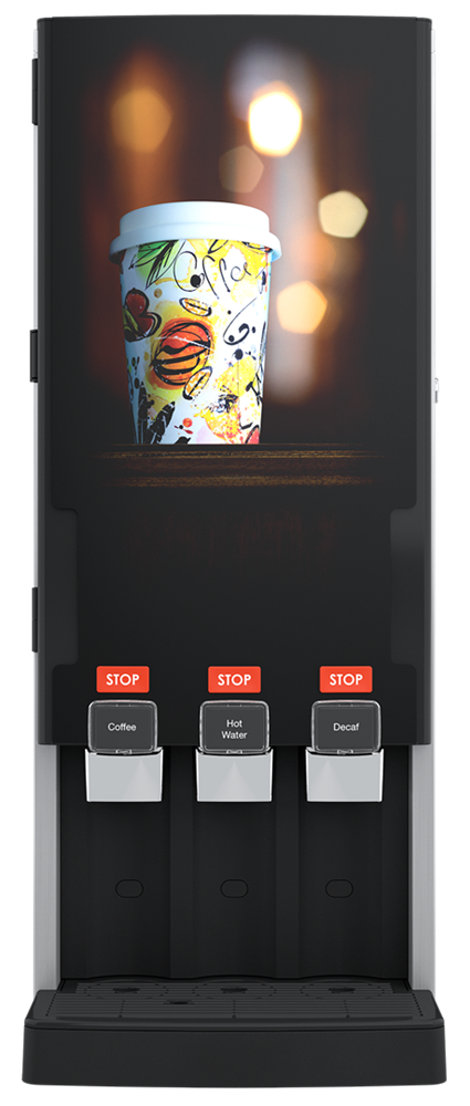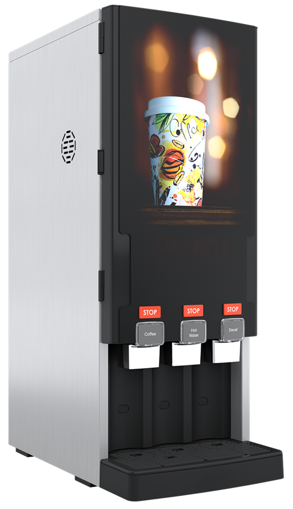 Modell für 2 BIB Behälter für Flüssigkonzentrat und 2 Instantproduktbehälter. Gesonderte Heißwasserausgabe. Getränkeauswahl variiert in Abhängigkeit von den eingesetzten Produkten.