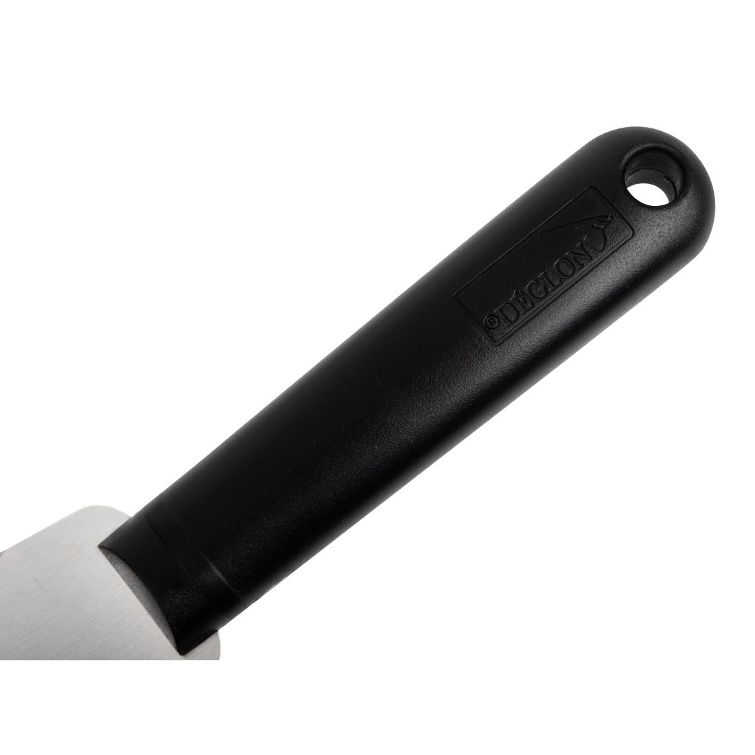 Edelstahlblatt und Kunststoffgriff. Geschirrspülergeeignet und Loch im Griff für sicheres "Parken" an den Rändern der Pfanne.
