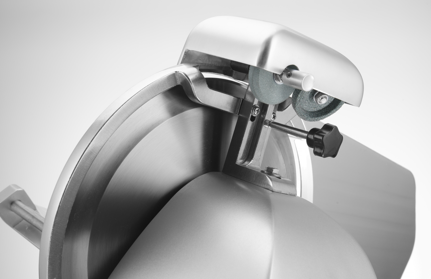 Für professionellen, gewerblichen Einsatz. Gehäuse aus beschichtetem Aluminium, mit rutschfesten Füßen. Schneidmesser aus gehärtetem nichtrostendem Stahl in schräger Stellung. Motor luftgekühlt mit Überhitzungssicherung. Hochleistungsmotor zum Schneiden von Wurstwaren. Die Aufschnittmaschine ist mit Messerschutz und integriertem Messerschärfer ausgestattet. Mit Schutzabdeckung sowie mit Restehalter und senkrechter Sperre. Möglichkeit schneller und einfacher Demontage zur Reinigung.