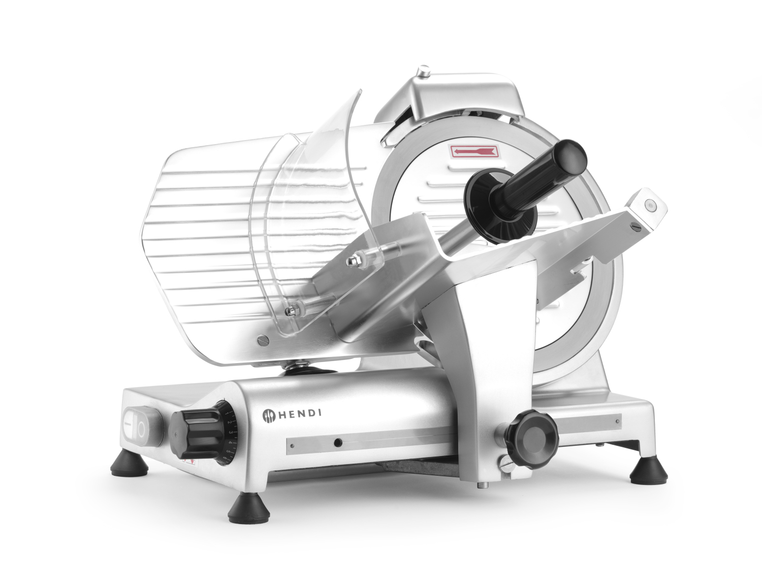Für professionellen, gewerblichen Einsatz. Gehäuse aus beschichtetem Aluminium, mit rutschfesten Füßen. Schneidmesser aus gehärtetem nichtrostendem Stahl in schräger Stellung. Motor luftgekühlt mit Überhitzungssicherung. Hochleistungsmotor zum Schneiden von Wurstwaren. Die Aufschnittmaschine ist mit Messerschutz und integriertem Messerschärfer ausgestattet. Mit Schutzabdeckung sowie mit Restehalter und senkrechter Sperre. Möglichkeit schneller und einfacher Demontage zur Reinigung.
