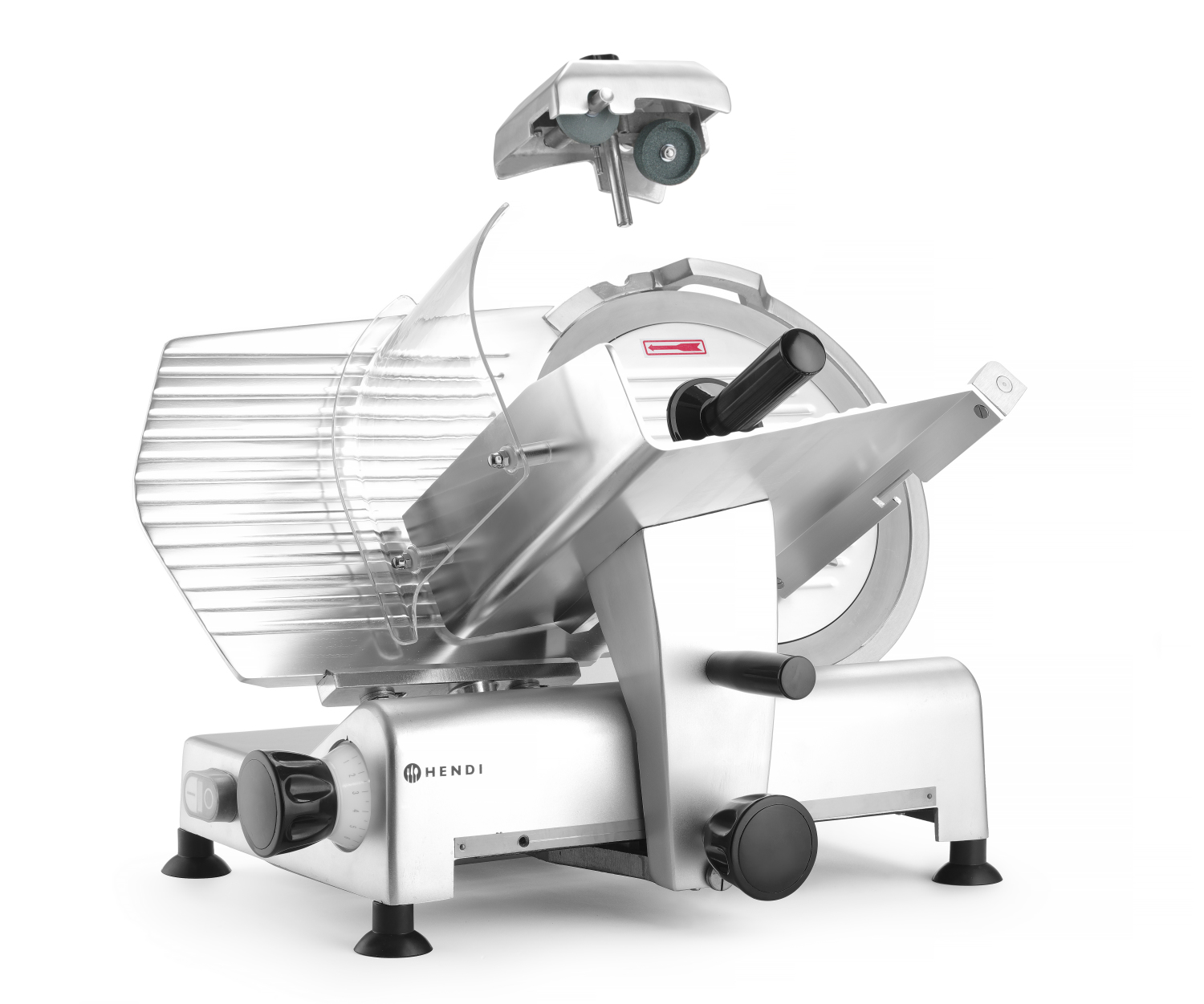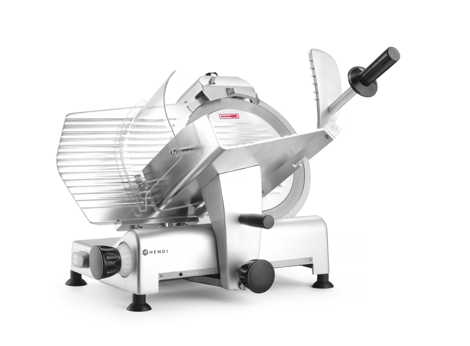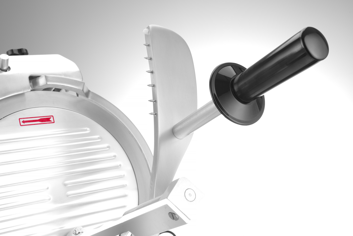 Für professionellen, gewerblichen Einsatz. Gehäuse aus beschichtetem Aluminium, mit rutschfesten Füßen. Schneidmesser aus gehärtetem nichtrostendem Stahl in schräger Stellung. Motor luftgekühlt mit Überhitzungssicherung. Hochleistungsmotor zum Schneiden von Wurstwaren. Die Aufschnittmaschine ist mit Messerschutz und integriertem Messerschärfer ausgestattet. Mit Schutzabdeckung sowie mit Restehalter und senkrechter Sperre. Möglichkeit schneller und einfacher Demontage zur Reinigung.