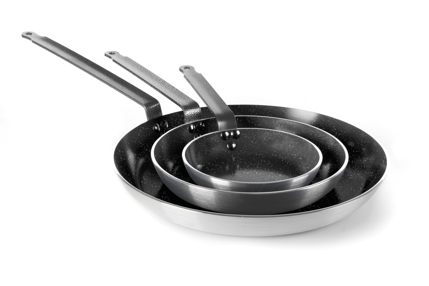 - Durch eine spezielle Dreifachbeschichtung sind die Pfannen sehr verschleißfest und einfach zu reinigen.