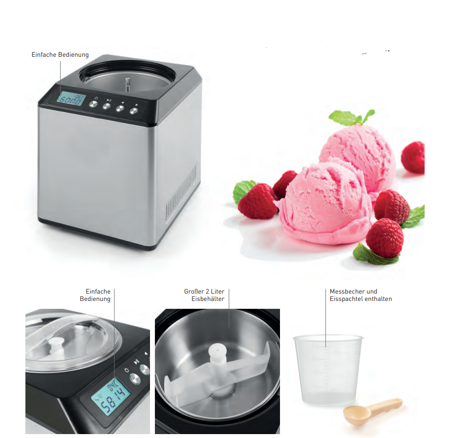 Ideal zur Herstellung von Eiscreme, Sorbets und Frozen Joghurt innerhalb 90 Minuten.
