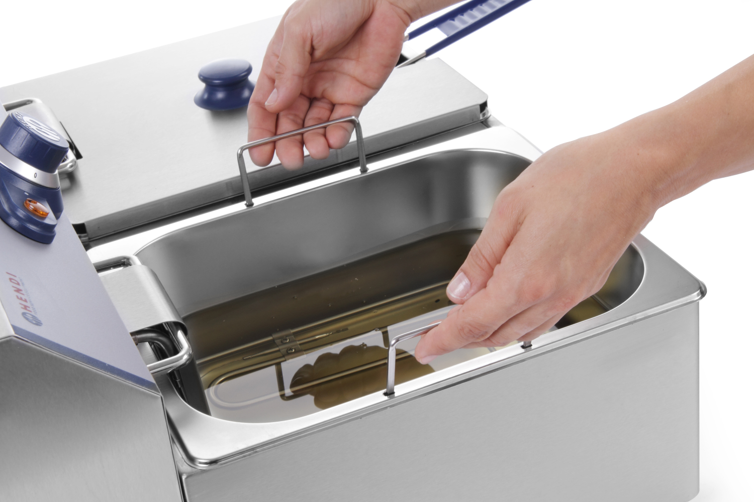 Frittierkorb mit wärmeisoliertem und extra langem Griff.