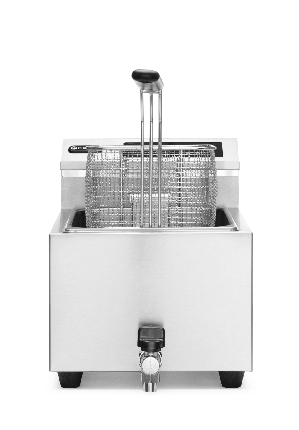 Die Profi Line-Tischfritteusen sind aus Edelstahl 18/0 gefertigt. Element mit Abschaltfunktion beim Entfernen. Der Öltank mit V-förmigem Boden sorgt für eine optimale Kältezone und erhöht die Lebensdauer des Öls. Die übersichtliche Steuerung mit Temperaturkontrollleuchten befindet sich auf der Oberseite des Geräts. Schutz gegen Überhitzung durch eine rückstellbare Thermosicherung. Ein Frittierkorb mit extra langem Griff macht dieses Modell zu einem feinen Gerät für den intensiven Gebrauch. Alle Fritteusen werden mit Frittierkorb und Deckel geliefert. Ausgestattet mit einem digitalen Bedienfeld mit Temperatur- und Timerfunktion.