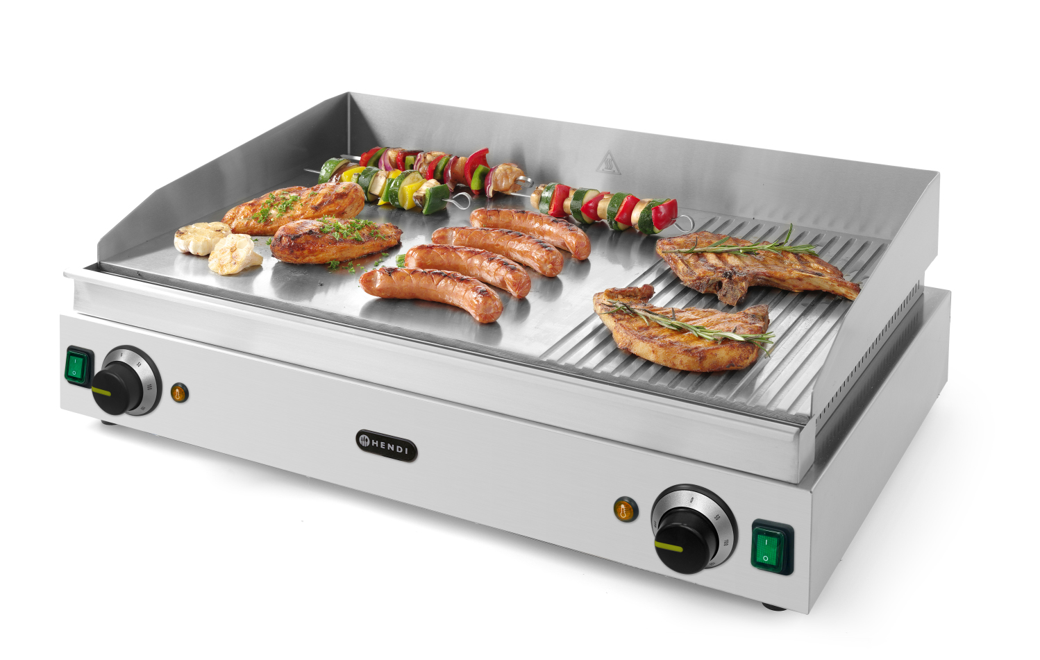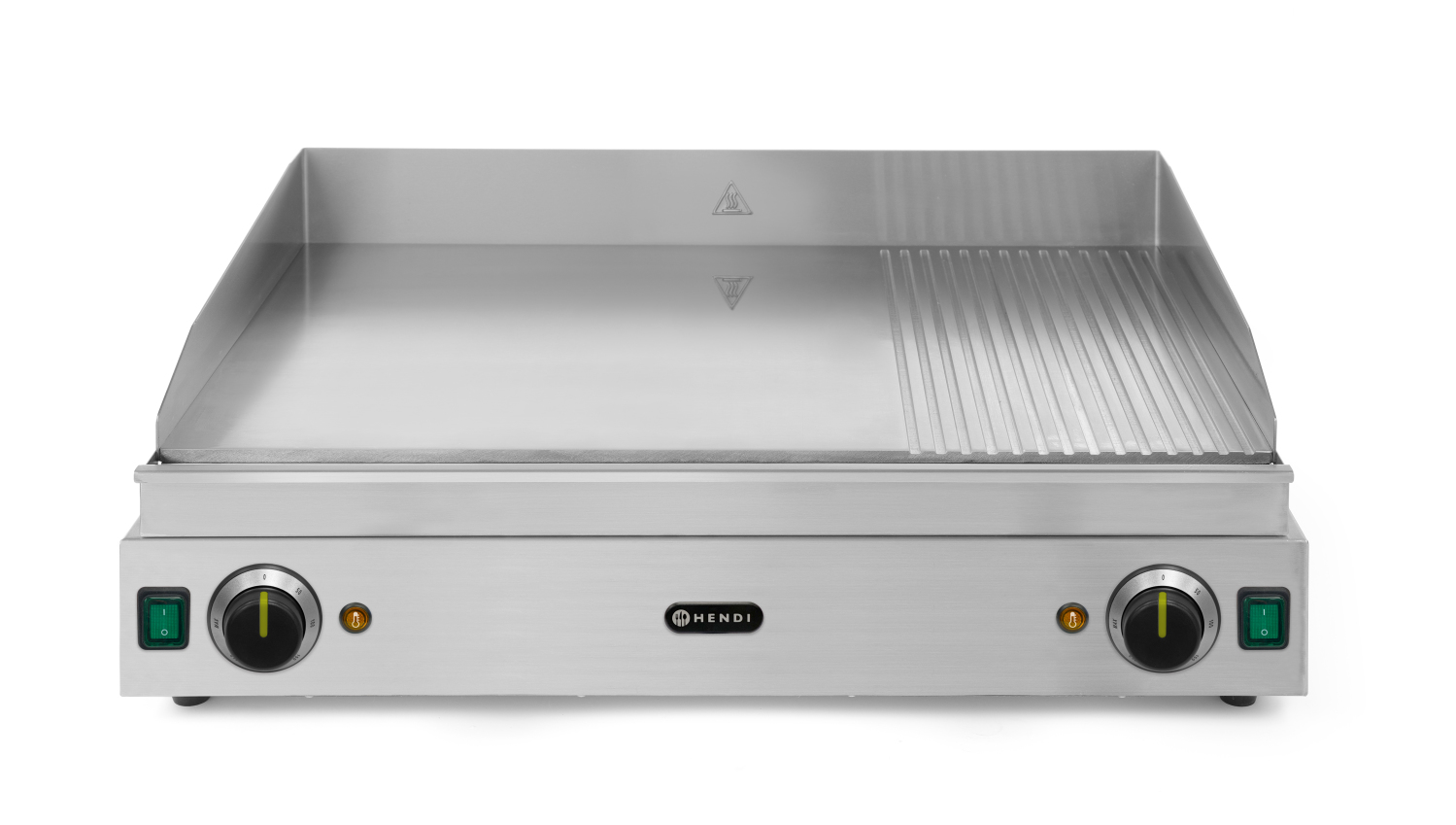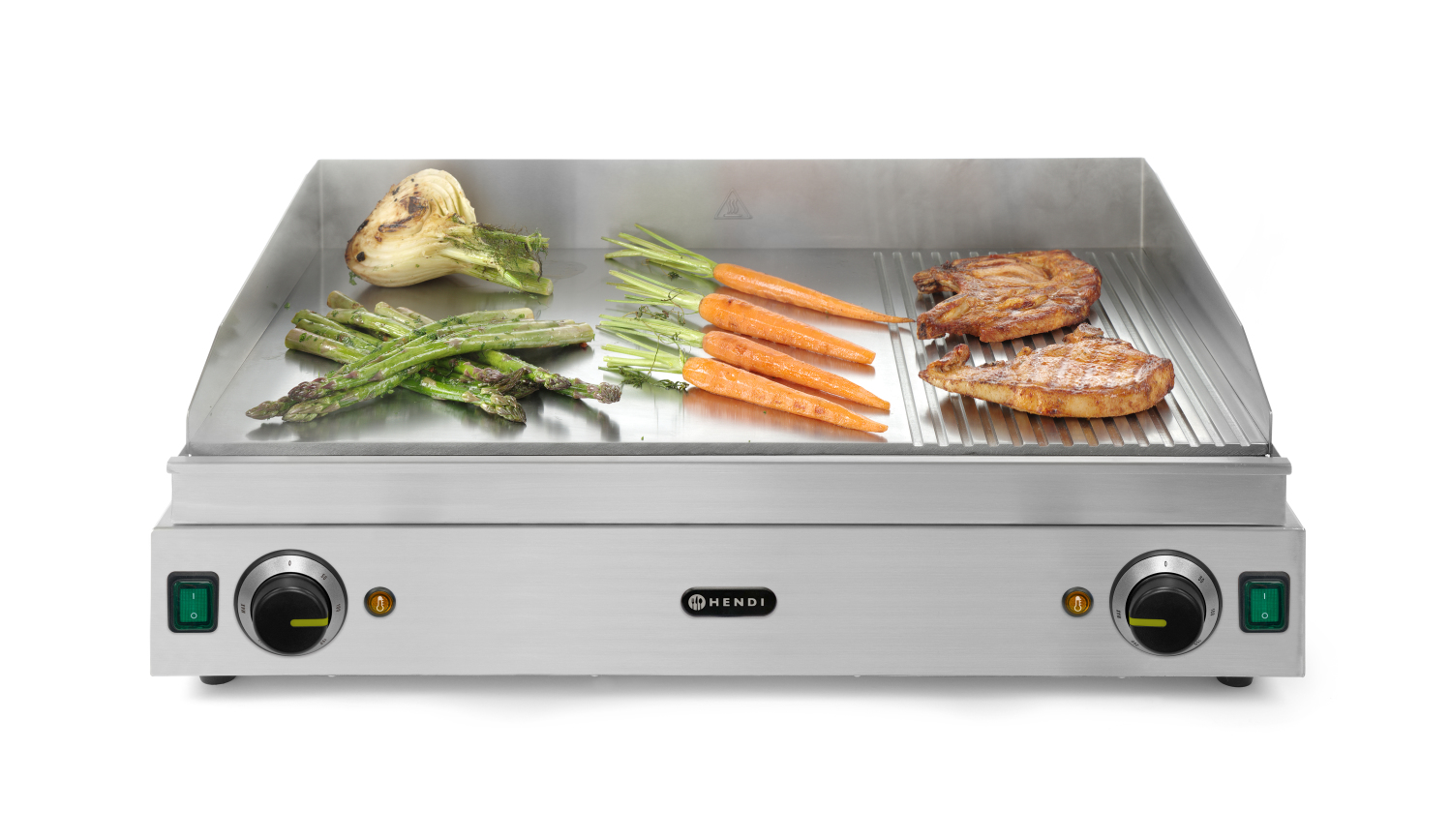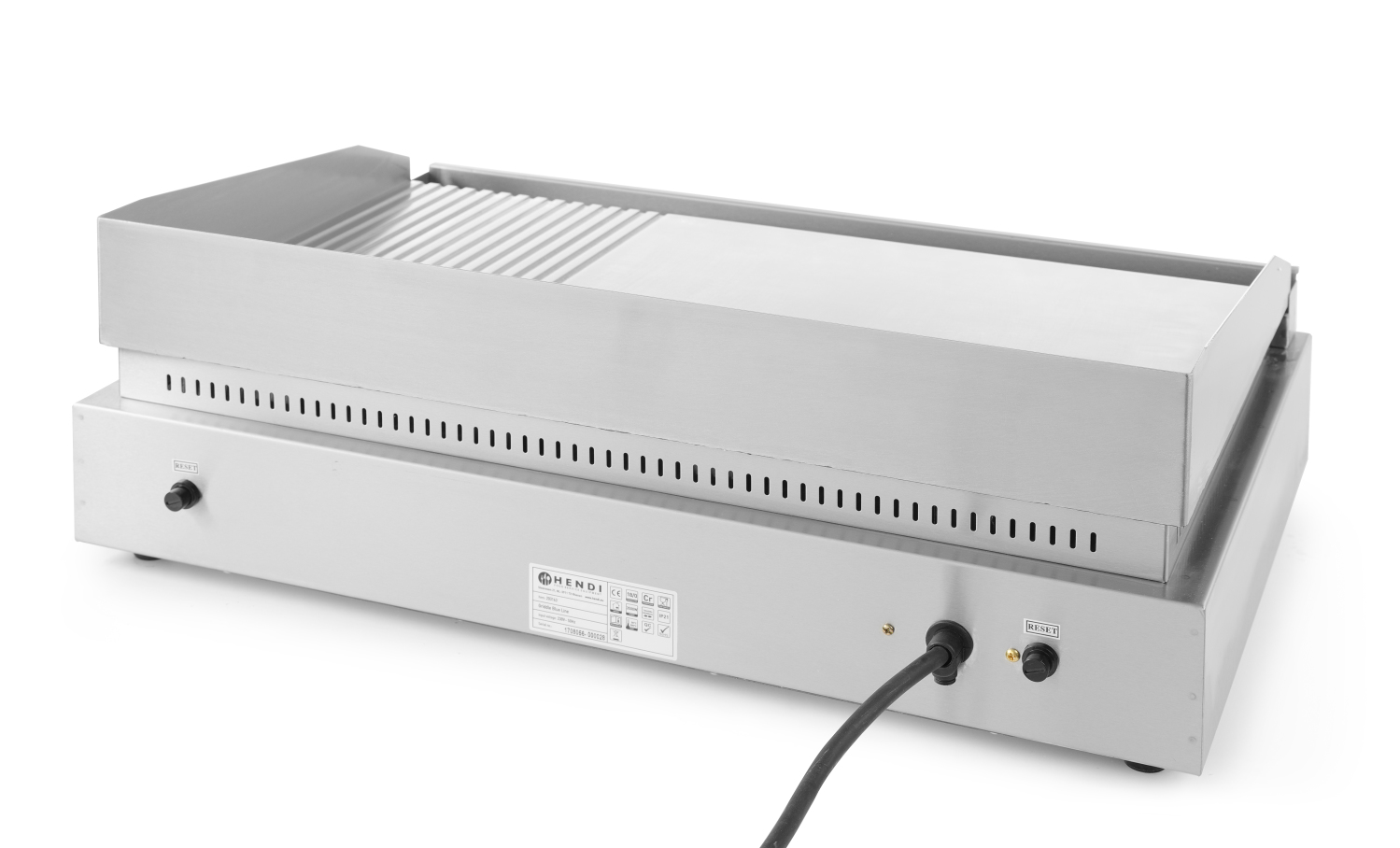 Gehäuse aus Edelstahl. Die hartverchromte Oberfläche (9 mm Platte) erleichtert die Reinigung. Mit abnehmbarer Tropfschale und hohen Aufkantungen. Stufenloser Thermostat, einstellbar bis 300°C. Überhitzungsschutz. Geeignet für den Dauereinsatz. Netzschalter mit integrierter Kontrollleuchte. Rutschfeste Füße. 2 unabhängige Arbeitsbereiche, 2 Heizungsanzeigeleuchten.