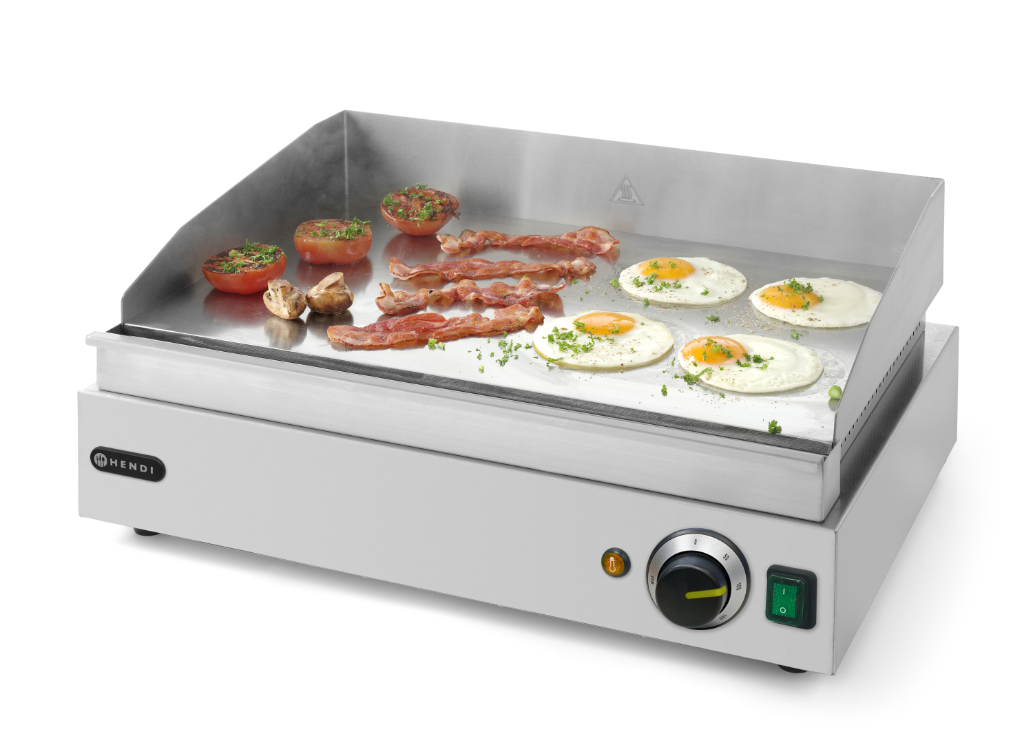 Gehäuse aus Edelstahl. Die hartverchromte Oberfläche (9 mm Platte) erleichtert die Reinigung. Mit abnehmbarer Tropfschale und hohen Aufkantungen. Stufenloser Thermostat, einstellbar bis 300°C. Überhitzungsschutz. Geeignet für den Dauereinsatz. Netzschalter mit integrierter Kontrollleuchte. Rutschfeste Füße. Grillfläche 518x328 mm, glatte Ausführung.