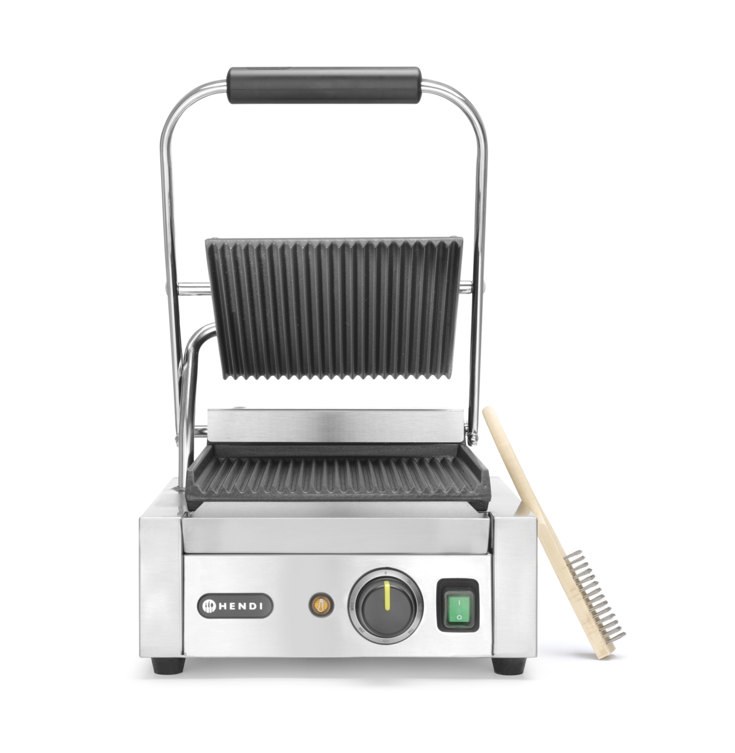 Gitter aus emailliertem Gusseisen. Rahmen aus Edelstahl. Mit Drahtbürste. Ausgestattet mit Fettschale und Aufkantung. Thermostat stufenlos regelbar bis max. 300°C, mit Kontrollleuchte. Mit angehobener Oberseite (H)530 mm. Grillfläche 220x230 mm.