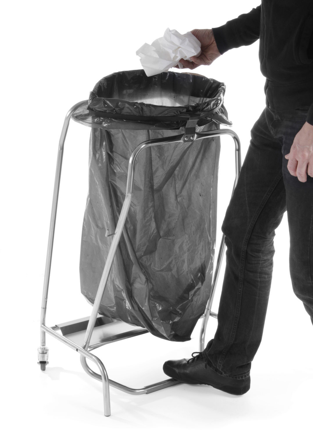 - Edelstahlrahmen. Die fußbetriebene Klappe hält den Müllbeutel verschlossen. 2 gebremste Lenkrollen.