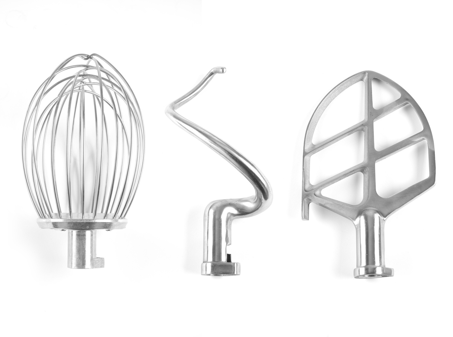 Inklusive Schüssel, Schläger, Schneebesen und Teighaken aus Edelstahl.