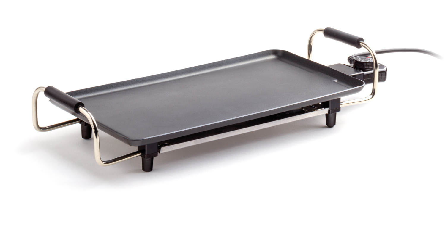 Abnehmbares und stufenlos verstellbares Steckerthermostat. Stabile Griffe für den sicheren Transport. Die Teppanyaki-Grillplatte ist leicht zu reinigen. Die Griddle-Oberfläche ist mit einer Antihaftbeschichtung versehen. Grilloberfläche: 440x230 mm.