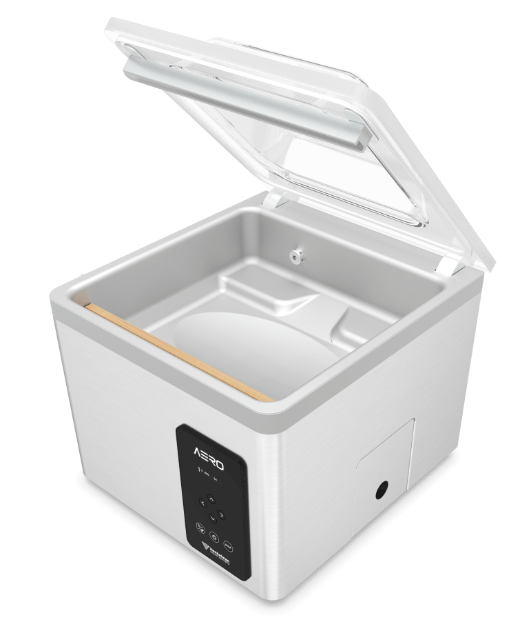 Wasserhaltige und flüssige Produkte wie Suppen und Saucen erreichen während des Vakuumierzyklus’ schnell den Siedepunkt. Senkt man den Kammerdruck unter den normalen Luftdruck ab, fangen Flüssigkeiten bereits bei Zimmertemperatur an zu sieden und kalte Produkte werden gekocht. Die Sensorfunktion erkennt unmittelbar und zuverlässig den aus dem flüssigen Produkt entweichenden Dampf. Signalisiert der Sensor, dass der Siedepunkt erreicht ist, stoppt die Maschine mit dem Absaugen der Luft und beginnt mit der Versiegelung des Beutels. Verwenden Sie für eine perfekte Produktplatzierung eine Schrägeinlage. Nutzen Sie diese Option, um Schäden an Ihrer Vakuumverpackungsmaschine und dem flüssigen Produkt zu vermeiden.