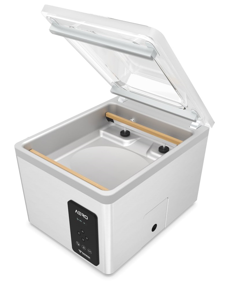 Wasserhaltige und flüssige Produkte wie Suppen und Saucen erreichen während des Vakuumierzyklus’ schnell den Siedepunkt. Senkt man den Kammerdruck unter den normalen Luftdruck ab, fangen Flüssigkeiten bereits bei Zimmertemperatur an zu sieden und kalte Produkte werden gekocht. Die Sensorfunktion erkennt unmittelbar und zuverlässig den aus dem flüssigen Produkt entweichenden Dampf. Signalisiert der Sensor, dass der Siedepunkt erreicht ist, stoppt die Maschine mit dem Absaugen der Luft und beginnt mit der Versiegelung des Beutels. Verwenden Sie für eine perfekte Produktplatzierung eine Schrägeinlage. Nutzen Sie diese Option, um Schäden an Ihrer Vakuumverpackungsmaschine und dem flüssigen Produkt zu vermeiden.