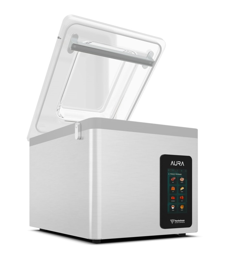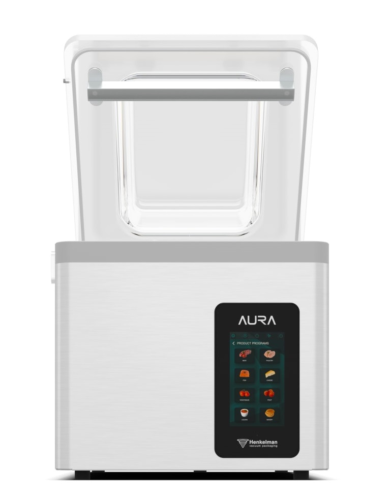 Elegantes Tischmodell mit höchstem Komfort für den Benutzer und einer endlosen Bandbreite vorprogrammierter Vakuumprogramme. Erzeugen Sie mit der fortschrittlichen Software Aura mühelos perfekt vakuumierte Produkte. Wählen Sie einfach auf dem H-Touch-Bedienfeld von Henkelman ein Produkt oder eine Abbildung aus und Aura schaltet die entsprechenden Funktionalitäten an oder aus. Intelligentes Vakuumieren, bei uns heißt das I-Vac. Mit Dutzenden von vordefinierten Endprodukten sorgt Aura dafür, dass jede bedienende Person jedes Produkt perfekt vakuumieren kann. Funktionalitäten wie Flüssigkeitskontrolle, Marinieren und Stufenvakuum sind in Aura standardmäßig vollständig integriert.