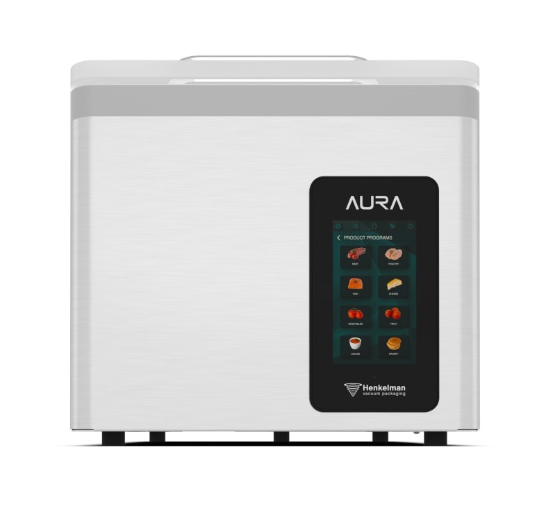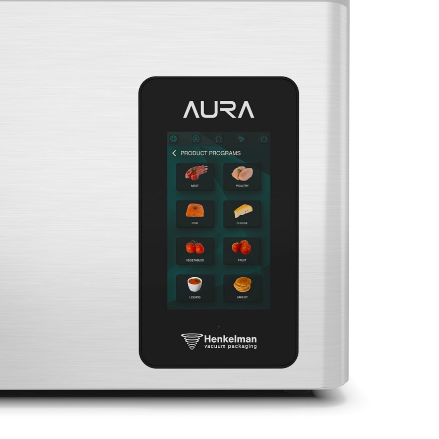 Aura ist das erste Produkt im Sortiment mit dem exklusiven, zukunftsweisenden farbigen Bedienfeld H-Touch von Henkelman. So wird die Bedienung der Maschine noch einfacher. Der moderne Touchscreen mit Grafiken macht das Navigieren zwischen den Optionen so simpel, dass jede bedienende Person problemlos das gewünschte Programm findet. Und dann heißt es nur noch „Click & Go“. Denn eins ist sicher: Mit dieser innovativen Benutzeroberfläche ist das Verpacken so unkompliziert wie noch nie.
