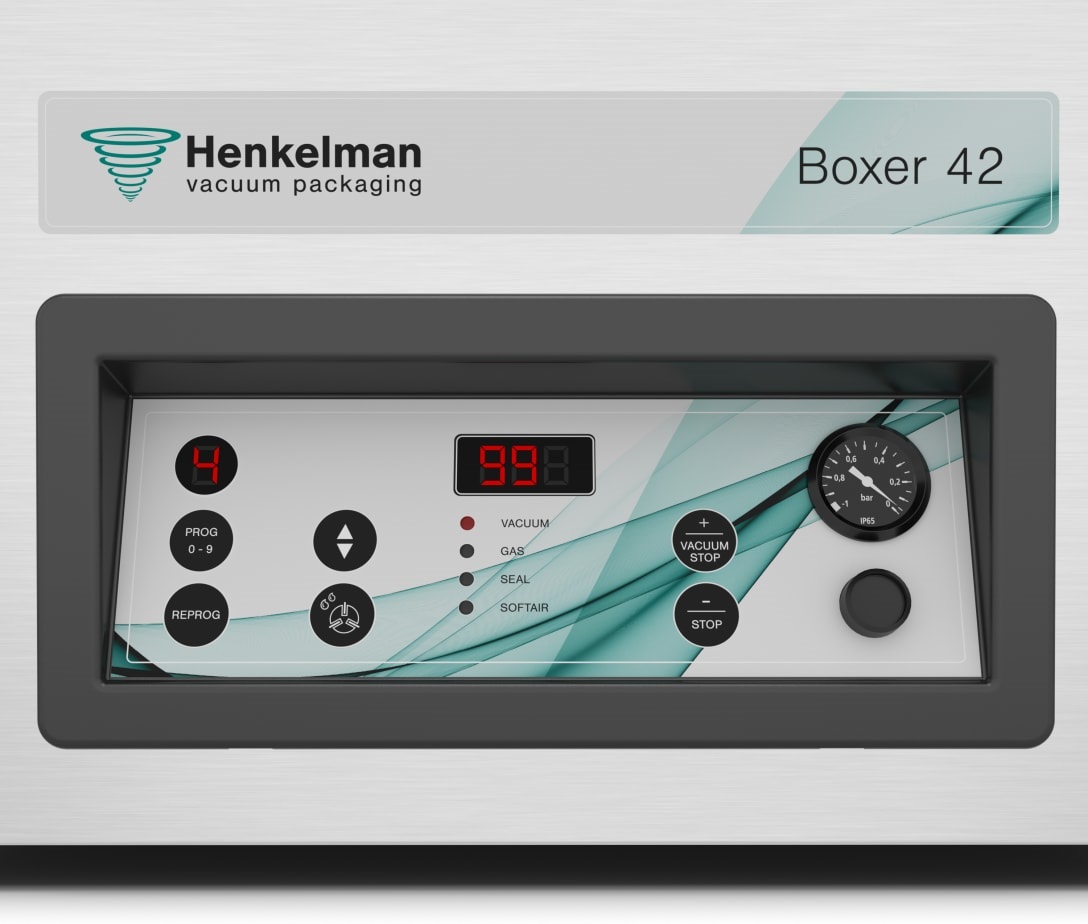 Die robuste Boxer 42 Vakuumverpackungsmaschine aus Edelstahl ist standardmäßig mit einer Busch Vakuumpumpe und einer Digitalen Steuerung mit 10 Vorwahlprogramme ausgestattet. Dieses Tischmodell entspricht den CE-Normen.