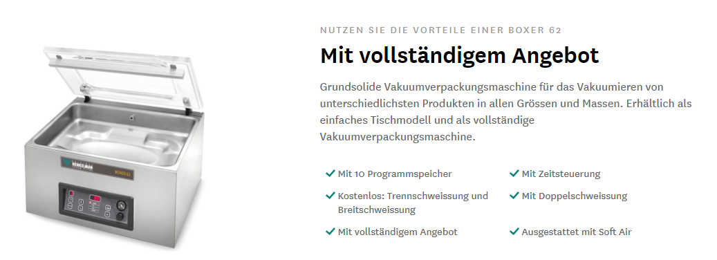 Die robuste Boxer 62 Vakuumverpackungsmaschine aus Edelstahl ist standardmäßig mit zwei Schweissleisten, einer Busch Vakuumpumpe und einer Digitalen Steuerung mit 10 Vorwahlprogramme aus-gestattet. Dieses Tischmodell entspricht den CE-Normen.
