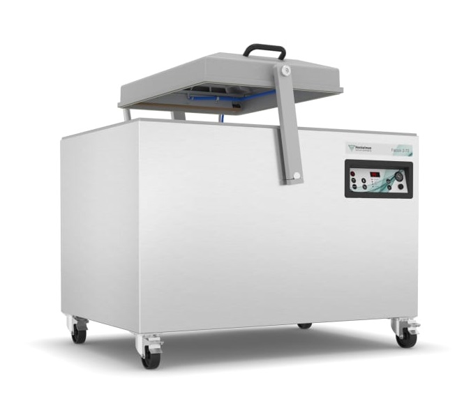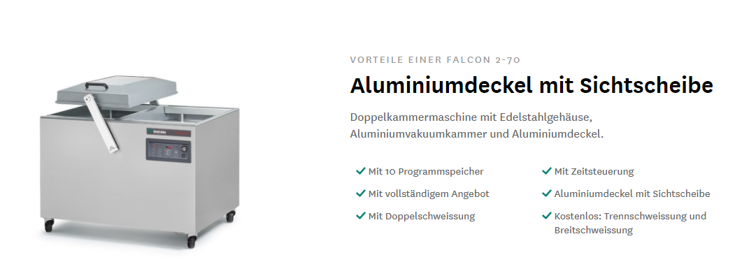 Die robuste Falcon 2-70 Vakuumverpackungsmaschine mit Aluminiumkammer und –deckel ist standardmäßig mit zwei Schweissleisten, einer Busch Vakuumpumpe und einer Digitalen Steuerung mit 10 Vorwahlprogramme ausgestattet. Dieses Doppelkammermaschine entspricht den CE-Normen.