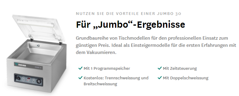 Die robuste Jumbo 30 Vakuumverpackungsmaschine aus Edelstahl ist standardmäßig mit einer Busch Vakuumpumpe und einer Zeitsteuerung mit 1 Vorwahlprogramm ausgestattet. Dieses Tischmodell entspricht den CE-Normen.
