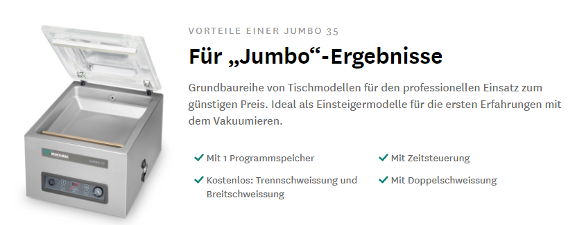 Die robuste Jumbo 35 Vakuumverpackungsmaschine aus Edelstahl ist standardmäßig mit einer Busch Vakuumpumpe und einer Zeitsteuerung mit 1 Vorwahlprogramm ausgestattet. Dieses Tischmodell entspricht den CE-Normen.