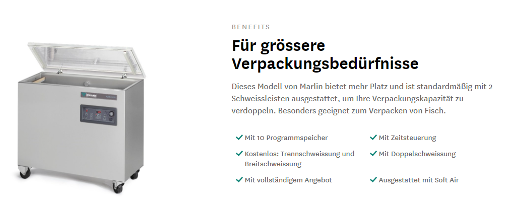 Die robuste Marlin 90 Vakuumverpackungsmaschine aus Edelstahl ist standardmäßig mit zwei Schweissleisten, einer Busch Vakuumpumpe und einer Digitalen Steuerung mit 10 Vorwahlprogramme ausgestattet. Dieses Standmodell entspricht den CE-Normen.