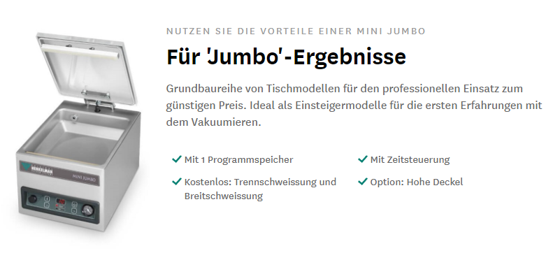 Die robuste Mini Jumbo Vakuumverpackungsmaschine aus Edelstahl ist standardmäßig mit einer Busch Vakuumpumpe und einer Zeitsteuerung mit 1 Vorwahlprogramm ausgestattet. Dieses Tischmodell entspricht den CE-Normen.