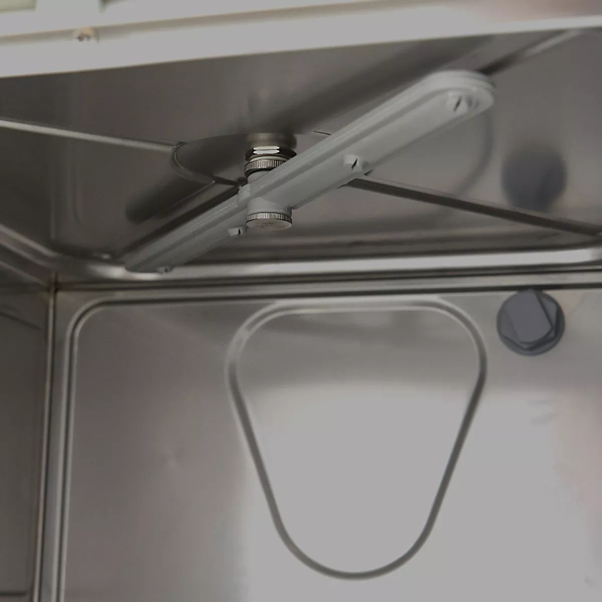Dank der leicht zu bedienenden Drucktasten ist diese Gläserspülmaschine sehr einfach zu bedienen. Es gibt zwei Tasten zum Ein- und Ausschalten des Geräts sowie zum Starten und Stoppen des Reinigungszyklus. Das Bedienfeld ist IPX4-geschützt, was bedeutet, dass kein Wasser in die Tasten eindringen kann. Pro Spülgang werden nur 2,5 l Wasser verbraucht, was diesen Gläserspüler sehr sparsam macht. Das Geschirr wird bei 60°C gewaschen und bei 65°C gespült, so dass es schnell trocknet. Die Gläserspülmaschine ist außerdem mit einer thermischen Sicherheitsvorrichtung ausgestattet, die eine sichere Benutzung gewährleistet. Dieses Gerät ist außerdem mit einem Rückschlagventil ausgestattet, so dass das Wasser nur in eine Richtung fließt.