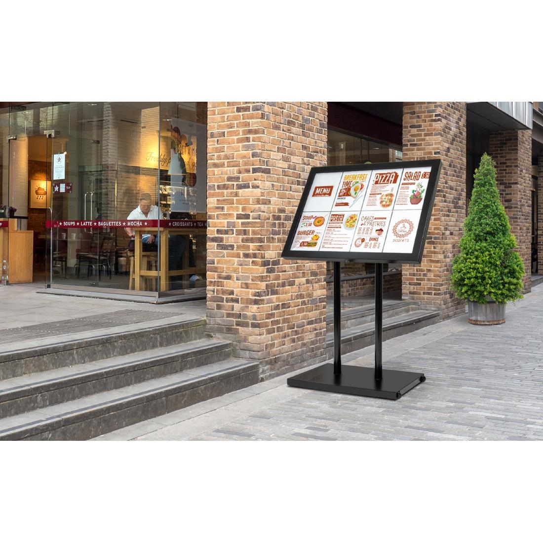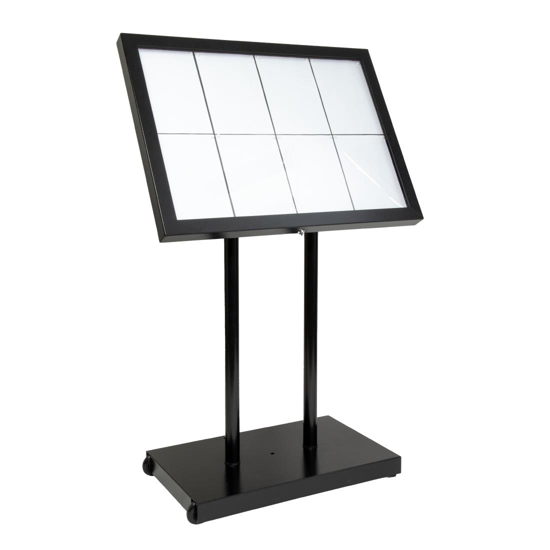 Menükartenhalter mit weissen LEDs aus schwarzem Stahl Securit 8xA4 mit Pfosten und Sockel.