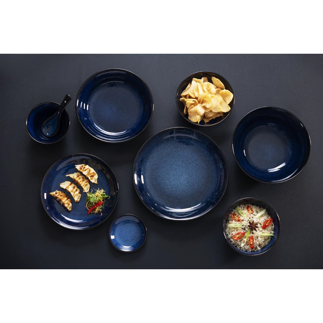 Die Luna-Reihe von Olympia hat eine mitternachtsblaue, reaktive Glasur auf der Vorderseite des Tellers/der Schüssel, ergänzt durch einen schwarzen Außenrand und eine schwarze Außenkante.