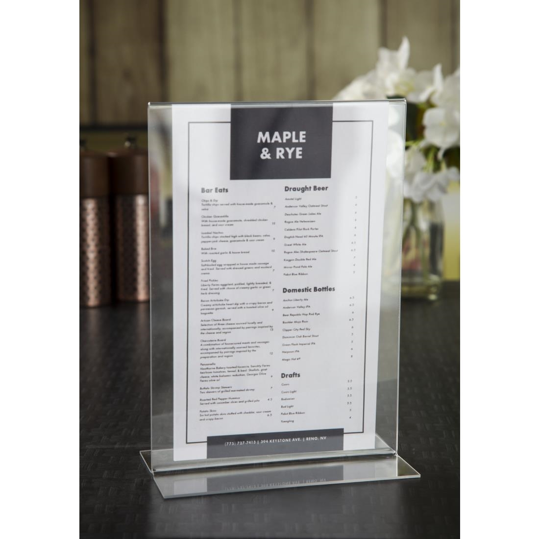 Kristallklare Acryl-Menükartenhalter im Hochformat. Papierseiten einfach seitlich einführen für eine effektive und freistehende Präsentation von Menüs oder anderen Informationen.