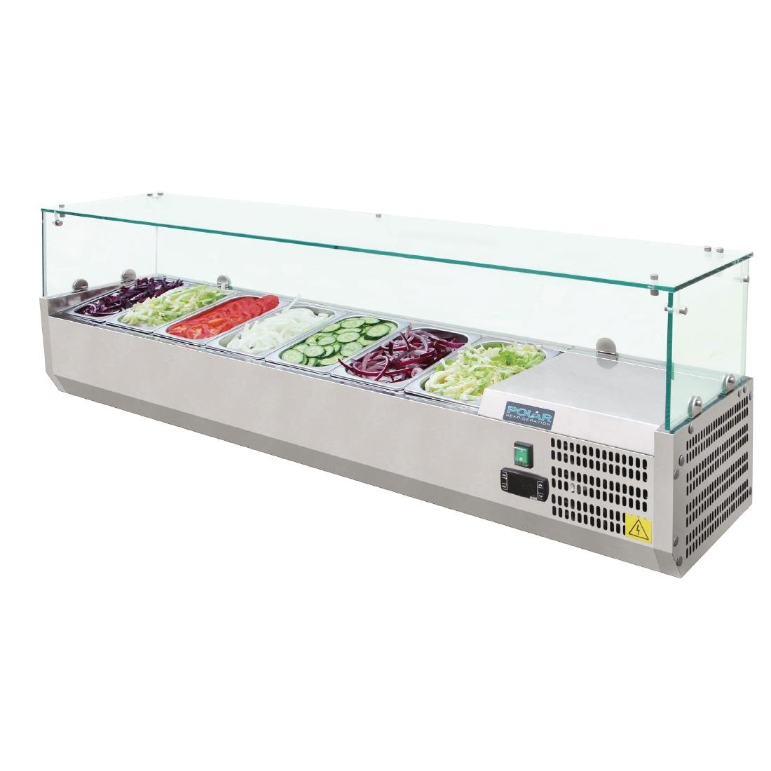 Innovative und vielseitige Aufsatzzubereitungsvitrine zum Servieren und Vorbereiten mit Sicherheitsglas umgeben. Geeignet für bis zu 10cm tiefe GN-Behälter. FCKW-frei. Erhältlich in vier Längen. Gastronormbehälter sind separat erhältlich.