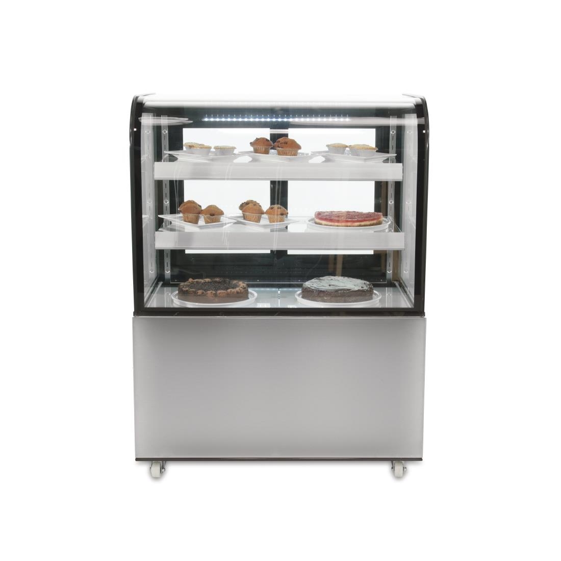 Attraktive Glasvitrine ideal zum Präsentieren von Torten, Gebäck und anderen frischen Produkten. Schiebetüren an der Rückseite für den einfachen Zugang. Zwangsbelüftung und automatische Abtauung.