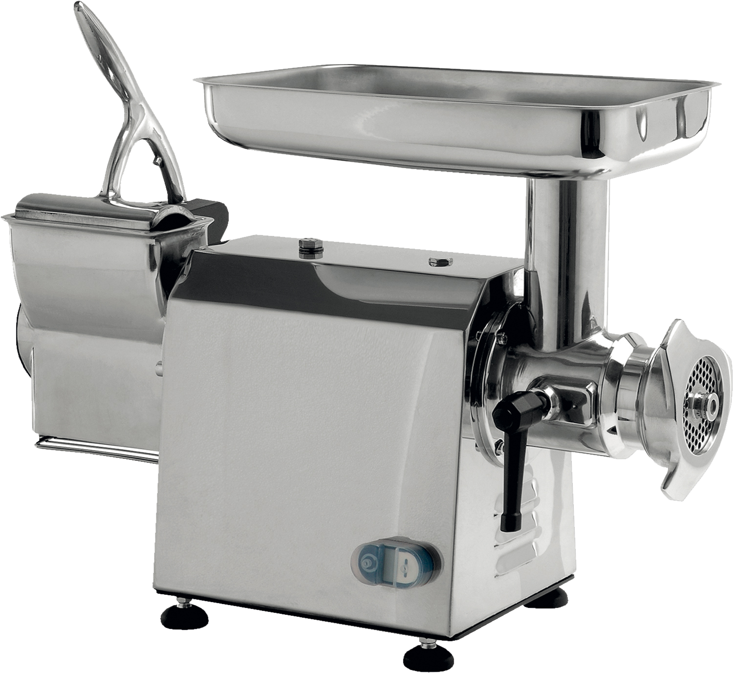 Ausführung: - Gehäuse aus eloxiertem Aluminium - belüfteter Asynchronmotor - hermetisch abgedichtetes Getriebe im Ölbad - Fleischwolföffnung Ø 82 mm - einzelne Bauteile zur Reinigung einfach entnehmbar - Enterprise-Schneidsystem, bestehend aus Schneidmesser & Lochscheibe - Mahlgruppe aus Edelstahl - Käsereibe aus Edelstahl Ausstattung: - mit Lochscheibe (Lochdurchmesser Ø 6 mm) - Käsereibe (nur für Hartkäse geeignet) Leistung: - Schneckenumdrehung: 140 U/min - ca. 300 kg Fleisch / h - Käsereibe 900 U/min - ca. 70 kg Käse / h - Motorleistung: 1,10 kW Anschluss: - Elektrischer Anschluss: 400 V / 3N / 50 Hz Maße (BxTxH): 220 x 610 x 440 mm