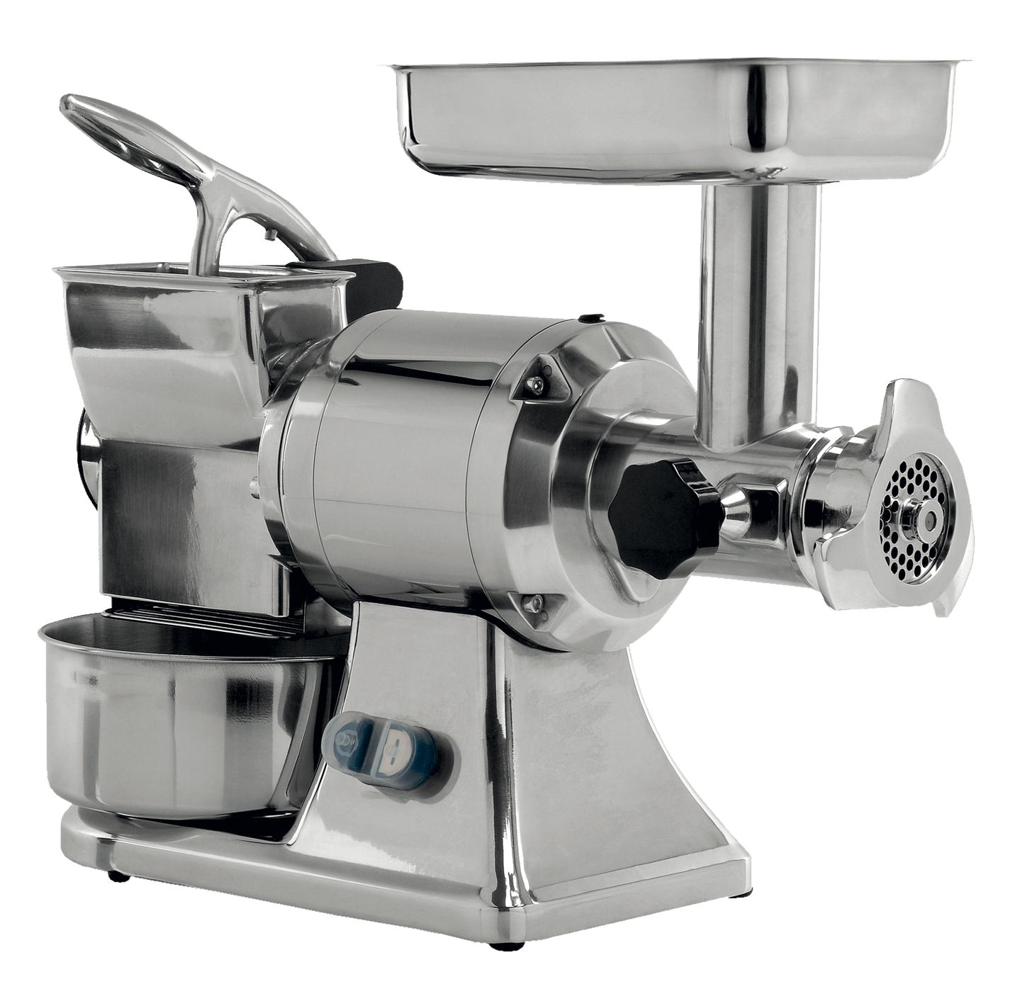Ausführung: - Gehäuse aus eloxiertem Aluminium - belüfteter Asynchronmotor - hermetisch abgedichtetes Getriebe im Ölbad - Fleischwolföffnung Ø 70 mm - einzelne Bauteile zur Reinigung einfach entnehmbar - Enterprise-Schneidsystem, bestehend aus Schneidmesser & Lochscheibe - Mahlgruppe aus vernickeltem Gusseisen - Käsereibe aus vernickeltem Stahl Ausstattung: - mit Lochscheibe (Lochdurchmesser Ø 6 mm) - Käsereibe (nur für Hartkäse geeignet) Leistung: - Schneckenumdrehung: 200 U/min - ca. 200 kg Fleisch / h - Käsereibe 1400 U/min - ca. 50 kg Käse / h - Motorleistung: 0,75 kW Anschluss: - Elektrischer Anschluss: 400 V / 3N / 50 Hz Maße (BxTxH): 550 x 200 x 460 mm