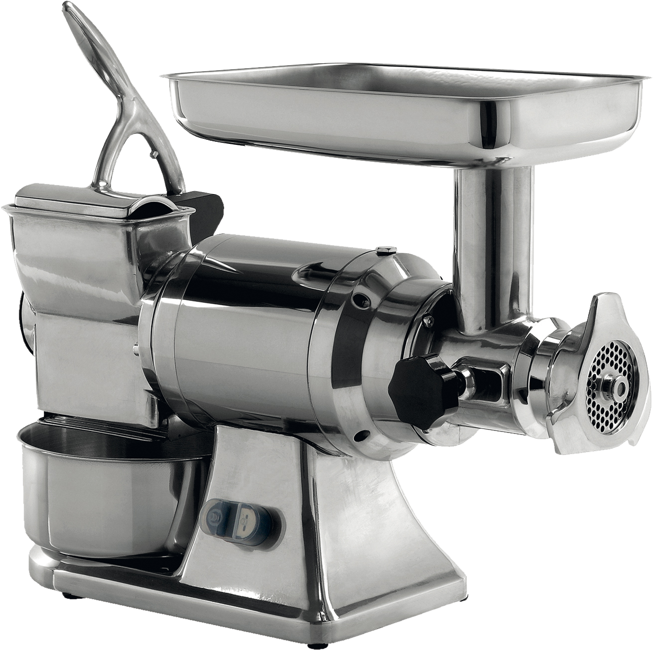 Ausführung: - Gehäuse aus eloxiertem Aluminium - belüfteter Asynchronmotor - hermetisch abgedichtetes Getriebe im Ölbad - Einfüllöffnung Ø 52 mm - Fleischwolföffnung Ø 82 mm - einzelne Bauteile zur Reinigung einfach entnehmbar - Enterprise-Schneidsystem, bestehend aus Schneidmesser & Lochscheibe - Mahlgruppe aus vernickeltem Gusseisen - Käsereibe aus vernickeltem Stahl Ausstattung: - mit Lochscheibe (Lochdurchmesser Ø 6 mm) - Käsereibe (nur für Hartkäse geeignet) Leistung: - Schneckenumdrehung: 140 U/min - ca. 300 kg Fleisch / h - Käsereibe 900 U/min - ca. 70 kg Käse / h - Motorleistung: 1,10 kW Anschluss: - Elektrischer Anschluss: 230 V / 1N / 50 Hz Maße (BxTxH): 220 x 610 x 460 mm