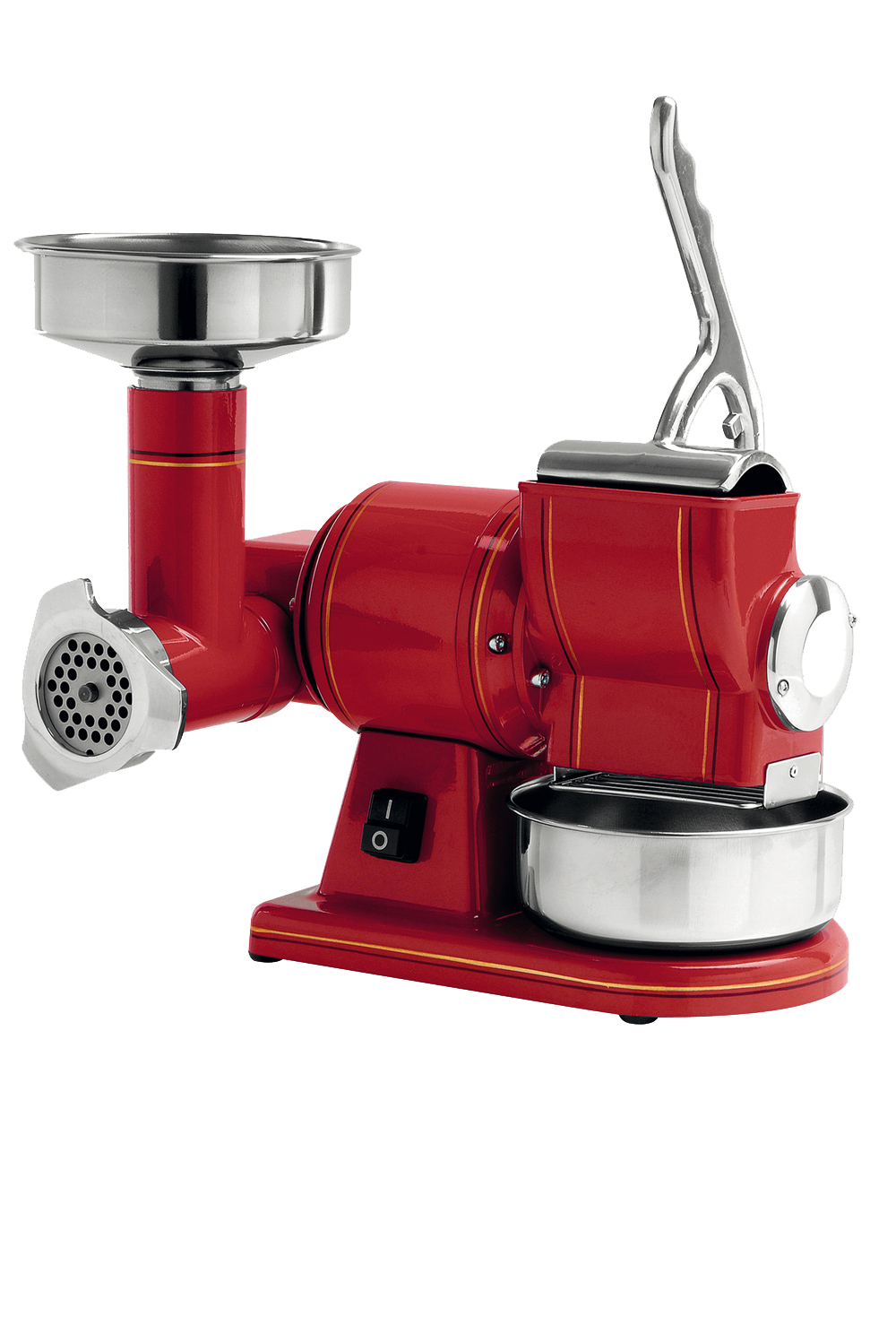 Ausführung: - Gehäuse aus lackiertem Aluminium - belüfteter Asynchronmotor - hermetisch abgedichtetes Getriebe im Ölbad - Einfüllöffnung Ø 52 mm - Fleischwolföffnung Ø 60 mm - einzelne Bauteile zur Reinigung einfach entnehmbar - Enterprise-Schneidsystem, bestehend aus Schneidmesser & Lochscheibe - Mahlgruppe aus Aluminium - Käsereibe aus Edelstahl Ausstattung: - mit Lochscheibe (Lochdurchmesser Ø 6 mm) - Käsereibe (nur für Hartkäse geeignet) Leistung: - Schneckenumdrehung: 80 U/min - ca. 30 kg Fleisch / h - Käsereibe 1.400 U/min - ca. 20 kg Käse / h - Motorleistung: 0,38 kW Anschluss: - Elektrischer Anschluss: 230 V / 1N / 50 Hz - mit Stecker in Schuko-Bauart nach CEE 7/7 Maße (BxTxH): 260 x 380 x 360 mm Hinweis: Der Fleischwolf ist für den semi-professionellen Einsatz und nicht für den Dauerbetrieb geeignet.