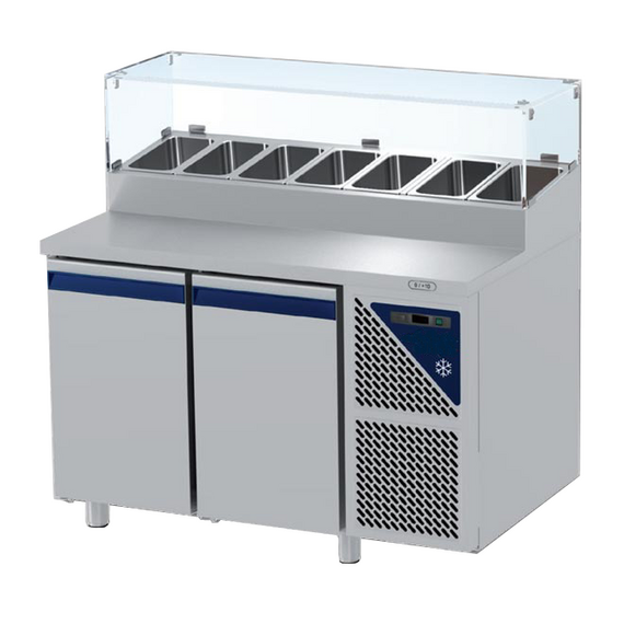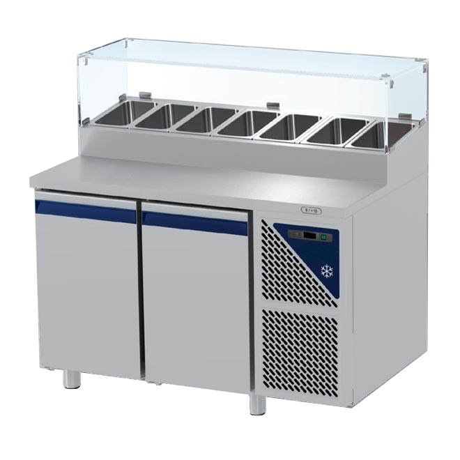 Ausführung: - Snackkühltisch mit Glasaufsatz - Korpus komplett aus Edelstahl - 60 mm Isolierung aus Polyurethan - gerundete Innenecken zur leichten Reinigung - Aggregat hinter der Frontblende - Doppelkammerdichtungen - Umluftkühlung - automatische Abtauung - Digitalthermostat - Kühlmittel: R134A - FCKW-frei - höhenverstellbare Schraubfüße Ausstattung: - 2 Türen für GN 1/1 Roste/Bleche - Inkl. 2x GN 1/1 Roste - inkl. 2x Einschubschienen-Paar - höhenverstellbare Schraubfüße Leistung: - Temperaturbereich: +0°C / +10°C, - bei Umgebungstemperatur: +30°C und relativer Luftfeuchte: 50% Material: - Chromnickelstahl (V2A) AISI 304, WNr. 1.4301 Anschluss: - Anschlusswert: 290 Watt - Elektrischer Anschluss: 230 V / 1N / 50 Hz Maße (BxTxH): 1280 x 700 x 1030 - 1080 mm